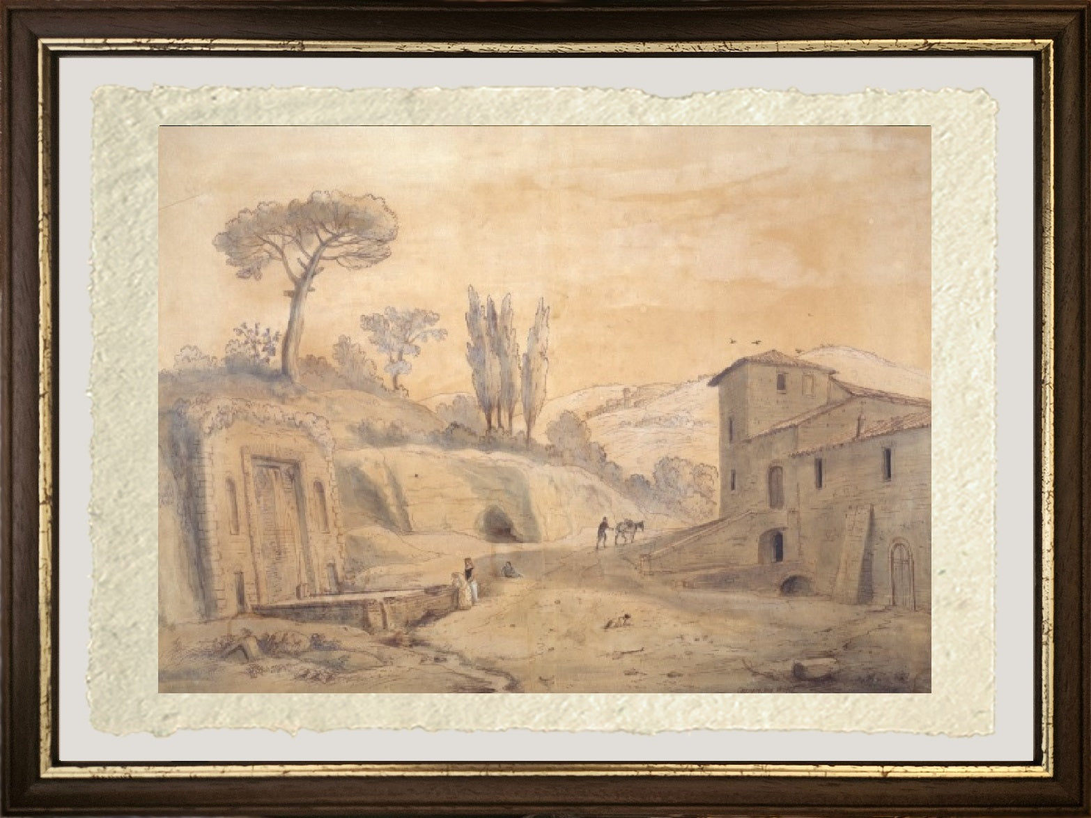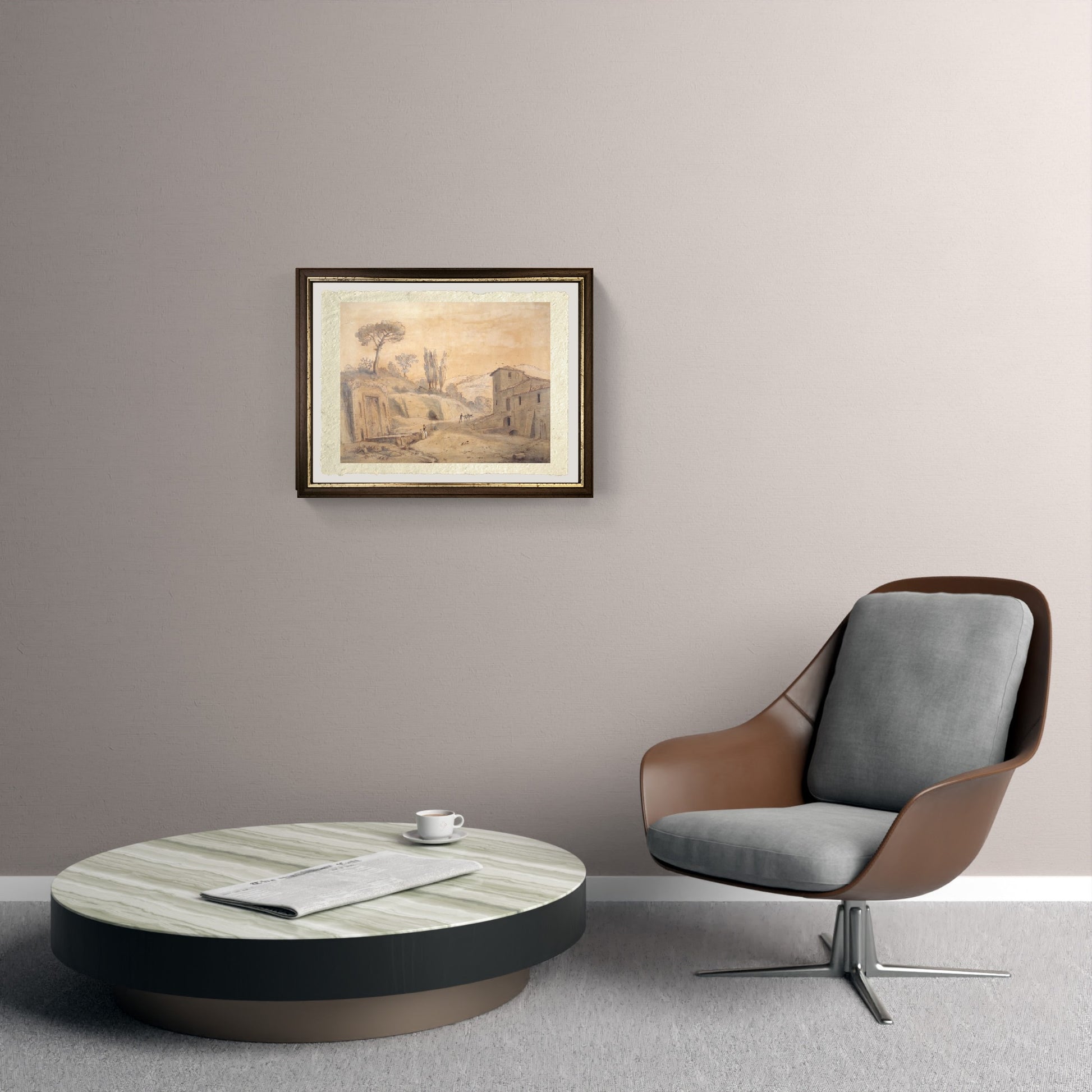 Magnificent historical view of Rome by Gaspare Vanvitelli, highlighting the Fontana Antica. In front, a road disappears into the hills; to the right, a rural house. The pen and tempera painting is predominantly light brown. The light is that of a setting sun. On the left, above the hill, are well-painted trees. This painting is also part of the extensive production Vanvitelli created during his stays in Rome.