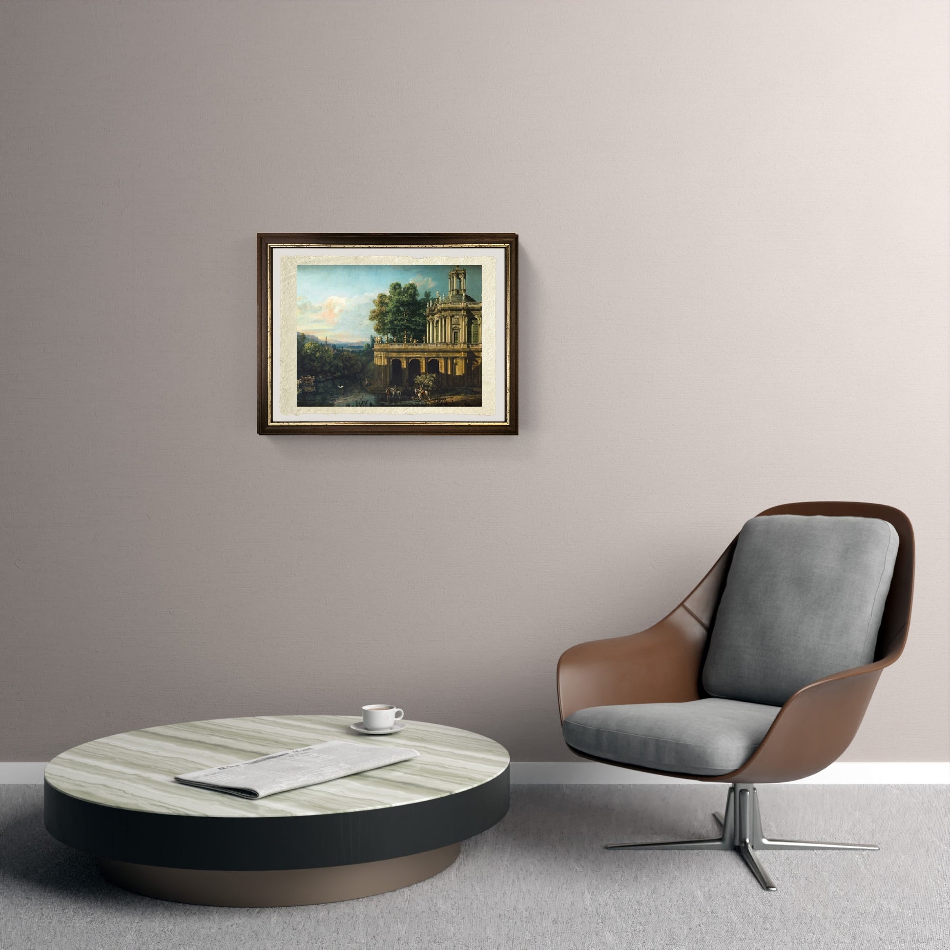 Romantic and original eighteenth-century capriccio view depicting a palace on the banks of a river, painted by Bernardo Bellotto. Highlighted on the right side there is a Baroque-style two-story palace, with the detail of the sun's shadow halfway down the ground floor. Outside there is a pond with scenes of everyday life, grazing cattle, and knights hunting. The sky is clear, but there are a few clouds on the horizon. In the background there are some blurred mountains. The painting is dated approx. 1766.