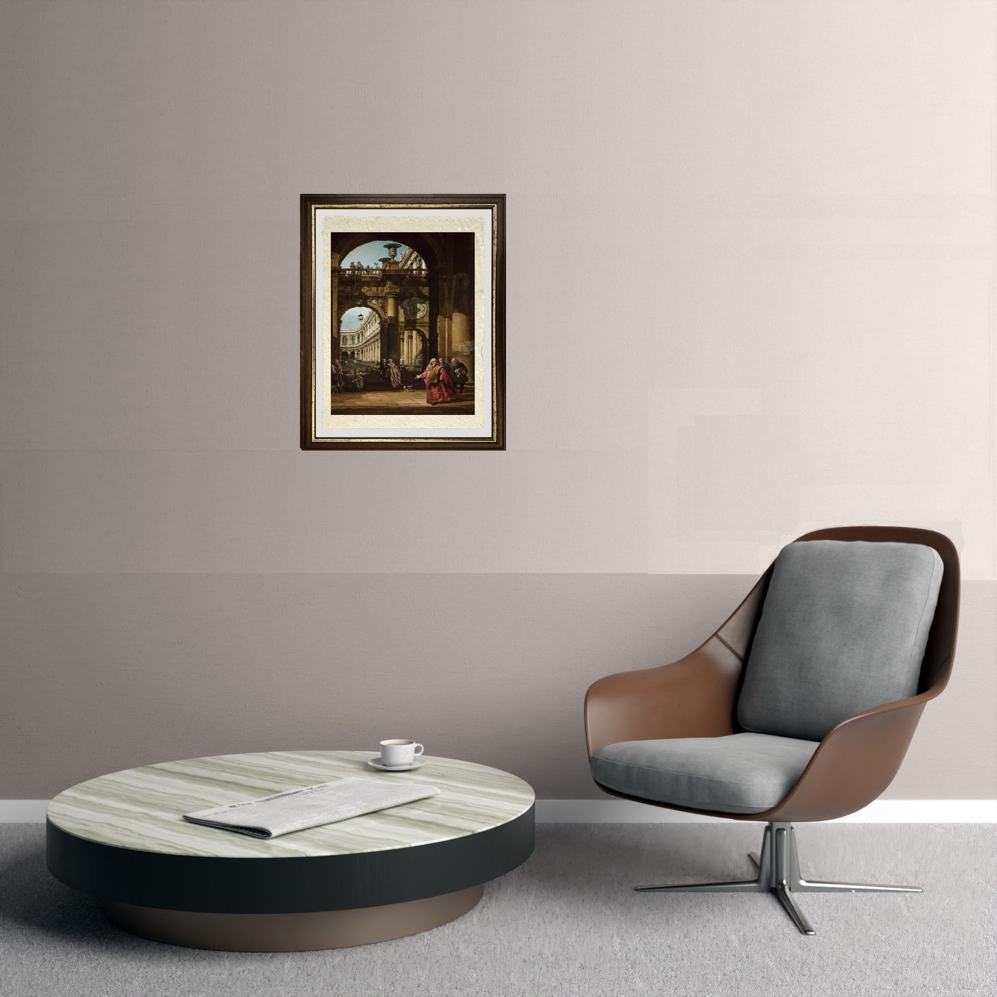 A unique and unusual view of an architectural capriccio featuring a self-portrait by Bernardo Bellotto as a Venetian nobleman. Bellotto is prominently depicted in a burgundy cloak, standing in front of the entrance to St. Mark's Square, accompanied by other nobles. The shadows cast on the arches leading to the square are to be noted. The sky is clear; the painting, an oil on canvas, is dated 1765.