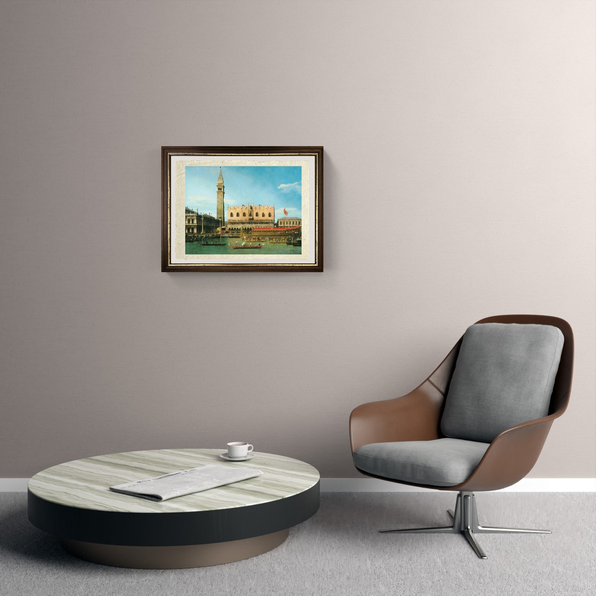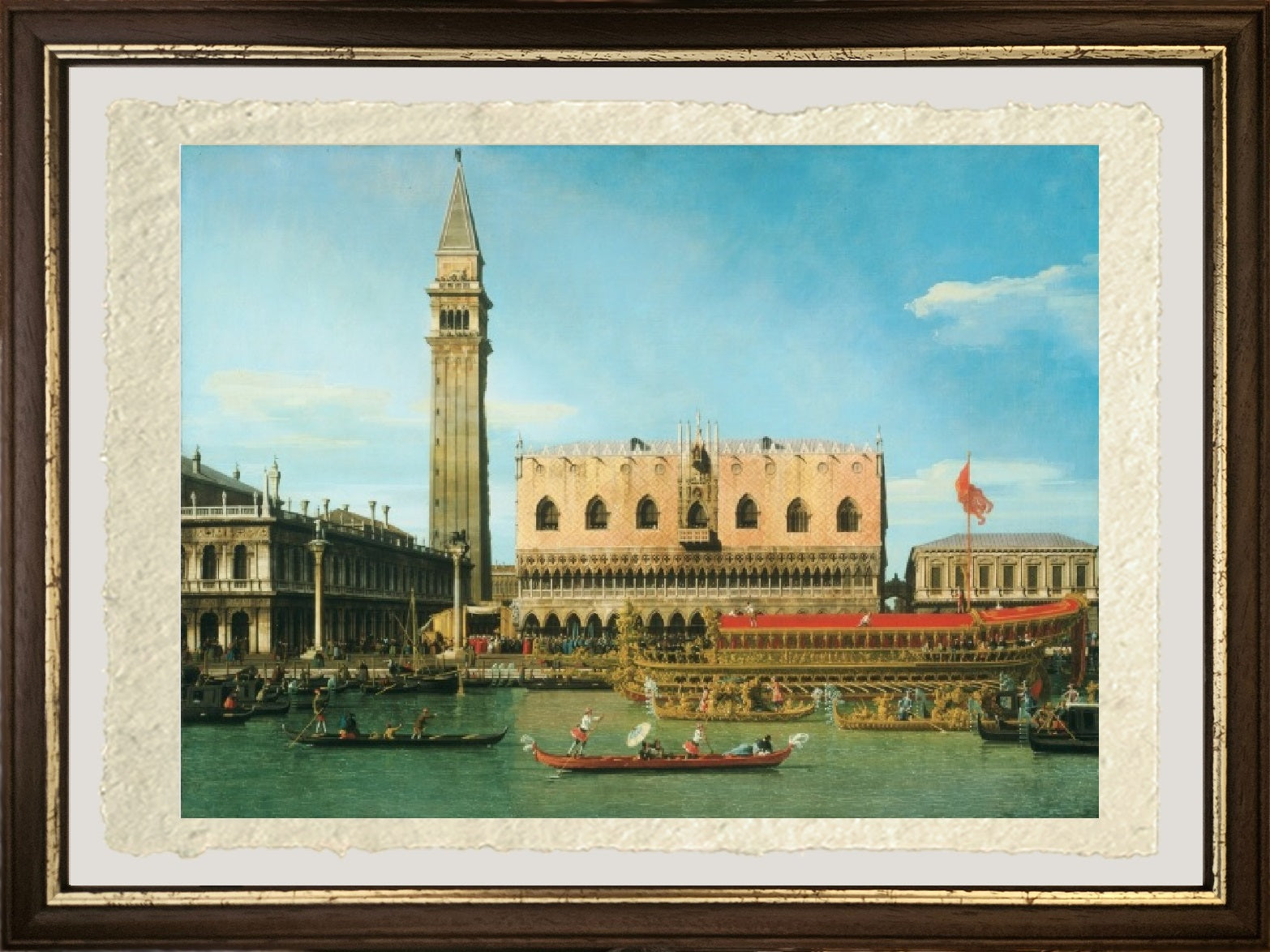 An original and luminous depiction of the Bucintoro's return to Venice on the Ascension Day, painted by Giovanni Antonio Canal. The foreground depicts the basin with all the boats surrounding the Bucintoro, which has the Venetian flag flying. A second small red boat carrying tourists is also prominent. The painting also depicts the Doge's Palace and the other buildings in Piazza San Marco, as well as the two columns of San Teodoro and San Marco. The sky is clear, with a few white clouds on the horizon.