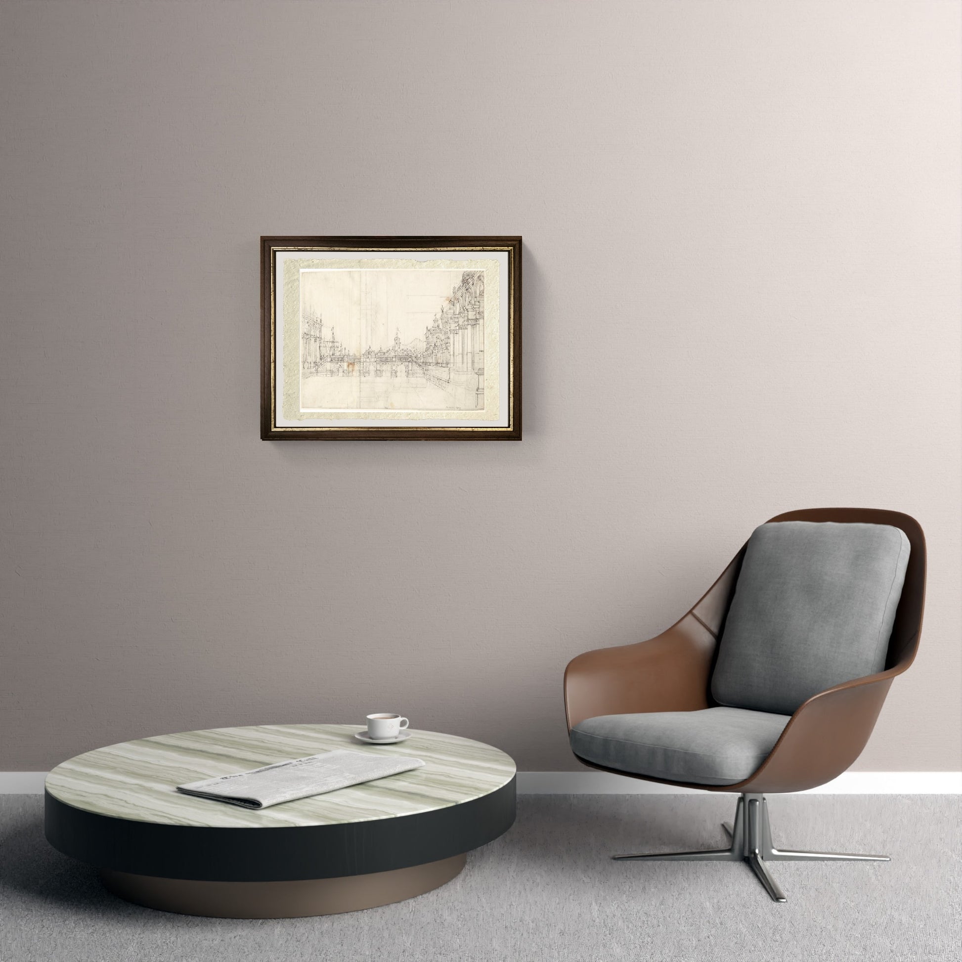 A romantic and original 18th-century view of a capriccio of palaces and a loggia facing a classical bridge, painted by Bernardo Bellotto. The drawing, executed in pen and black ink over graphite on two sheets of laid paper joined together, depicts the first palace on the left, connected to the second by a classical Roman-style bridge, with a prominent balustrade. On the right is the loggia, with beautiful arches and columns. The painting is undated.