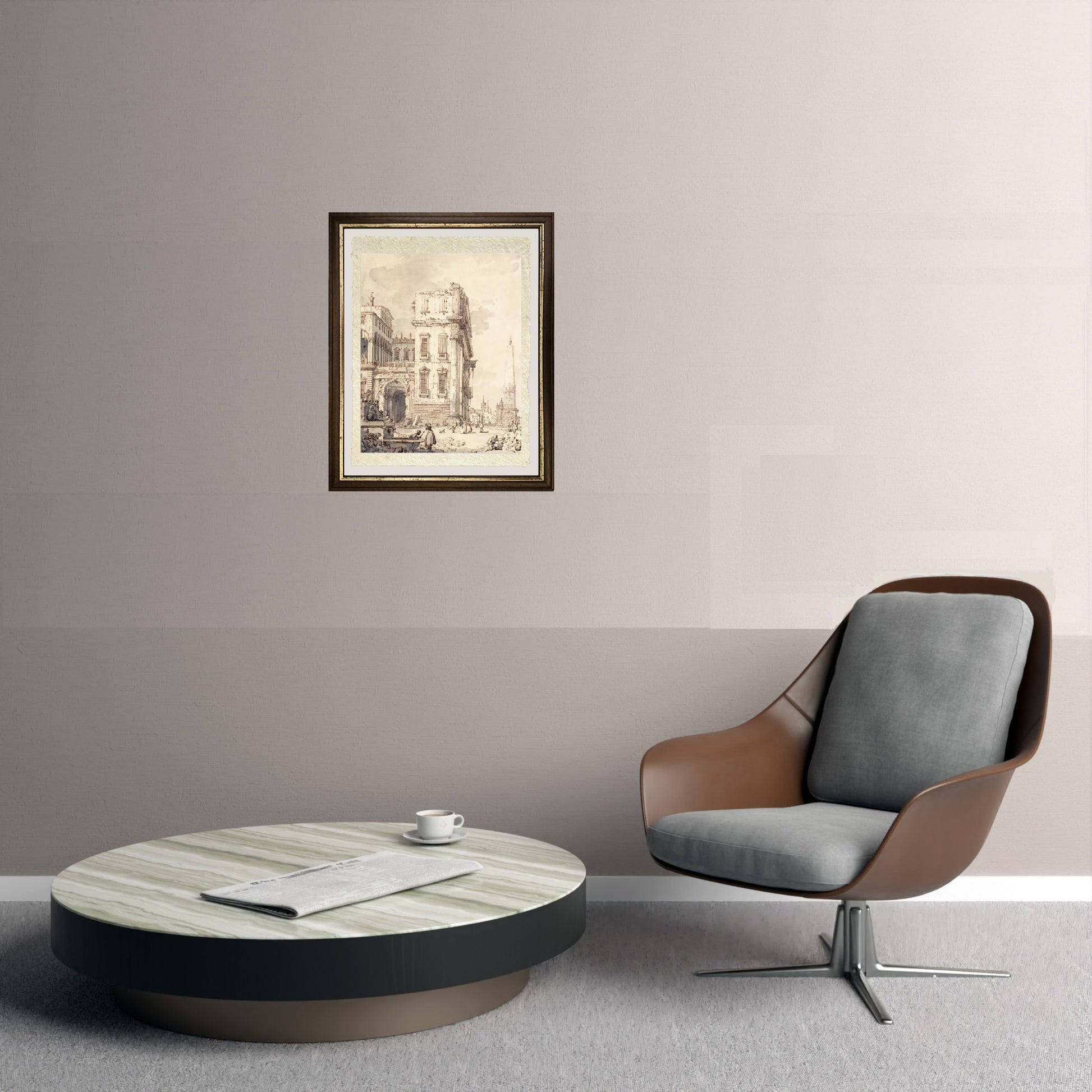 Original and rare 18th-century engraving of a Venetian palace by Giovanni Antonio Canal, known as Canaletto, executed in black chalk, pen and brown ink, and gray watercolor. In the foreground there is a three-story palace, with a front entrance, a staircase, and a small loggia on the second floor (detail). On the right there is an obelisk overlooking the small square in front of the palace, featuring scenes of daily life. The day is clear, with no clouds.