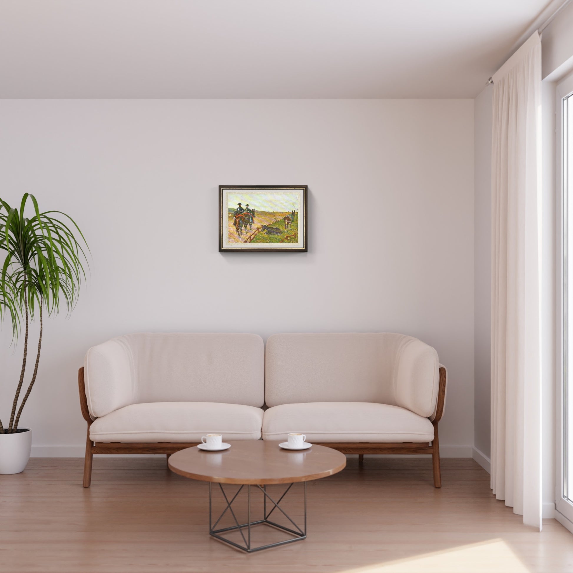 Mounted Carabinieri in Maremma (1890) represents the peak of Giovanni Fattori's maturity, where the macchia technique merges with an almost metaphysical solitude. Instead of celebrating the heroism of the great Risorgimento battles, the painting immortalizes two soldiers silently patrolling the vast Tuscan plain under an oppressive sky that flattens the horizon. The figures are constructed through synthetic chromatic contrasts between the arid tones of the earth and the dark silhouettes of their uniforms, making wild nature the true emotional protagonist of this dignified and melancholic slice of daily life.