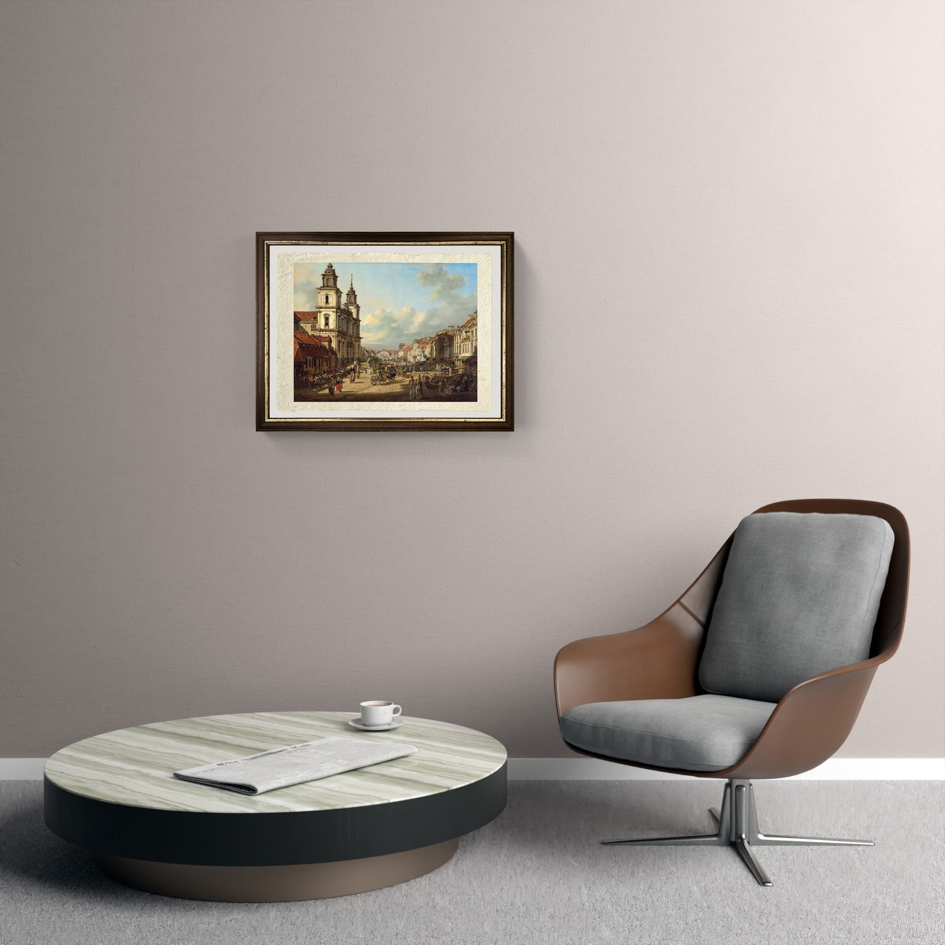 Original and luminous historic view of the Church of the Holy Cross from the side, with a perspective from Nowyswiat Street, painted by Bernardo Bellotto. The large church with its two bell towers stands out. In front, the square is depicted with scenes of daily life. On the left side, however, you can admire the large Nowyswiat Street, busy with both carriages and people. On the right, there are stalls and people.