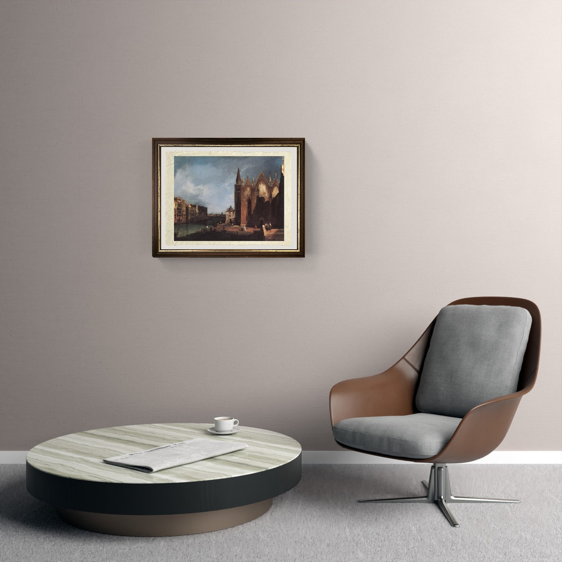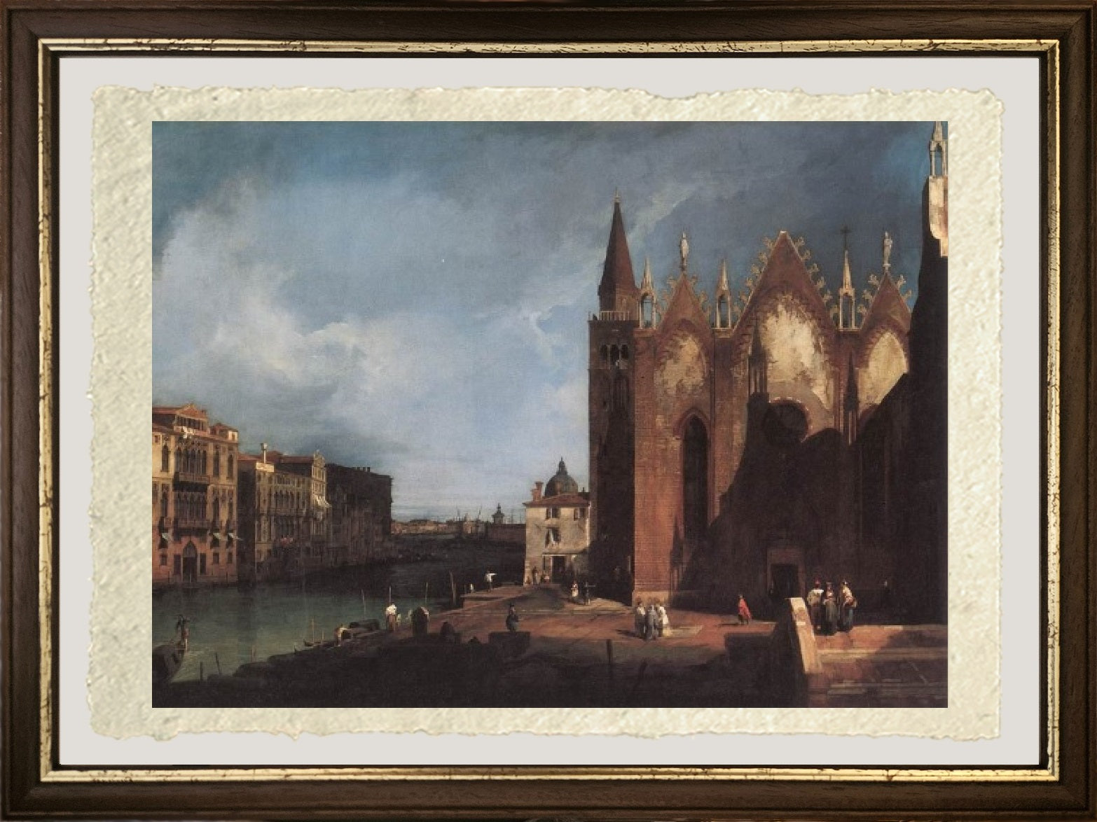 Original and rare 18th-century depiction of the Grand Canal near Santa Maria della Carità, painted by Giovanni Antonio Canal, known as Canaletto. In the foreground there is the small square in front of the churchyard of Santa Maria della Carità, while further to the left there is the Grand Canal, with its boats. Beyond the bank there are Venetian palaces. The sky is dark and cloudy, threatening rain.