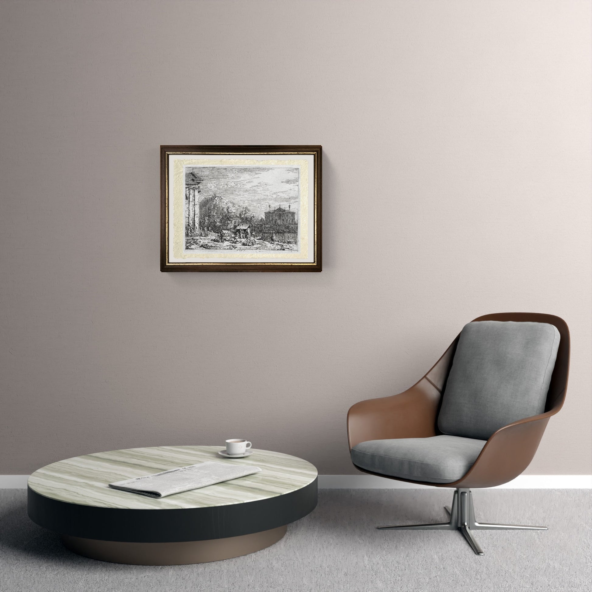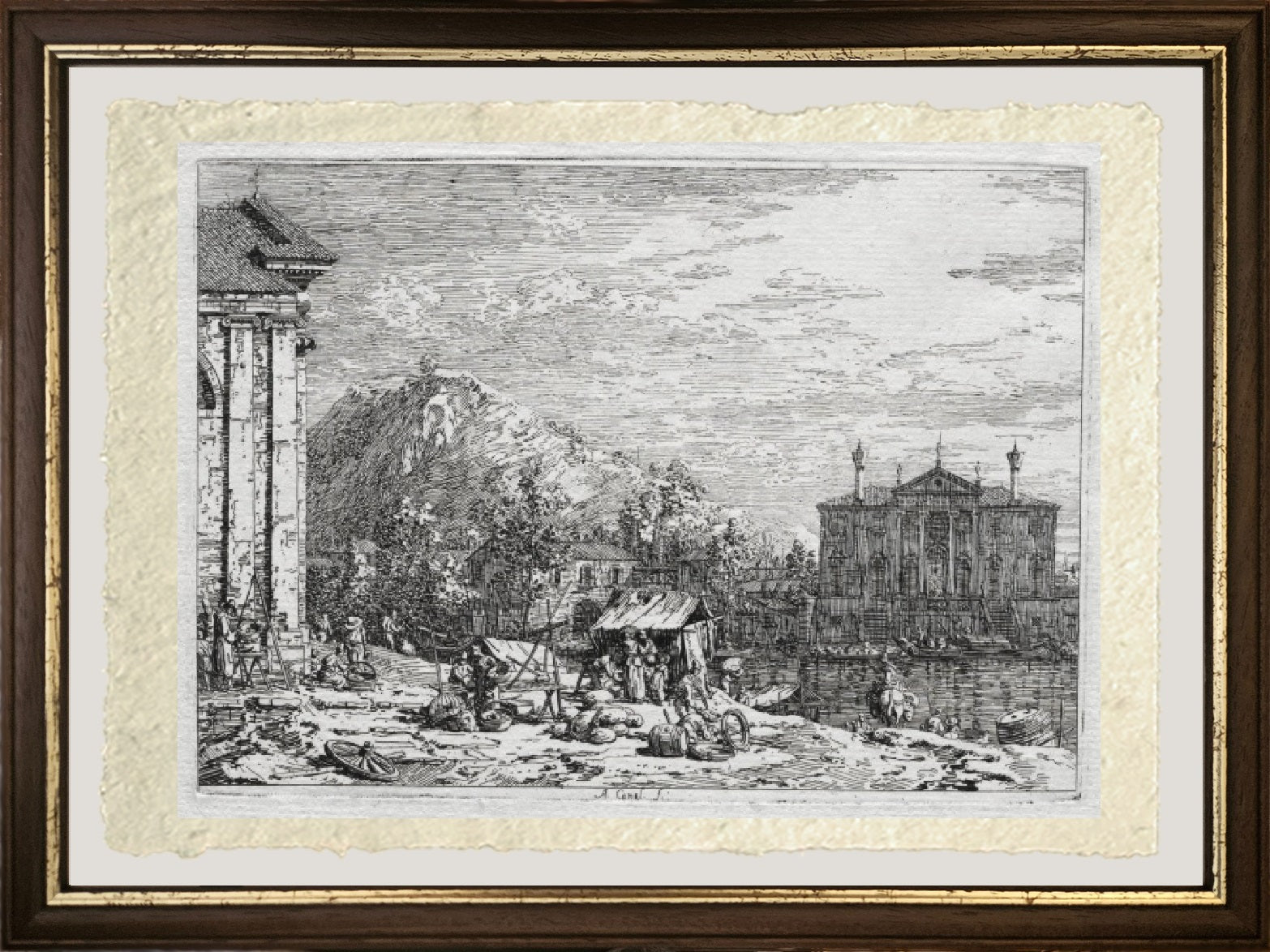 A rare 18th-century depiction of a city across a river, painted by Giovanni Antonio Canal, known as Canaletto. In the left foreground, we find a church, the riverbank, and a camp with scenes of daily life. Beyond the church, Canaletto depicts a Palladian-style villa. The river could be the Brenta or the Bacchiglione. Further into the background, beyond the river, there is a tenement house with a mountain in the background. The sky is clear, but with a few clouds on the horizon.
