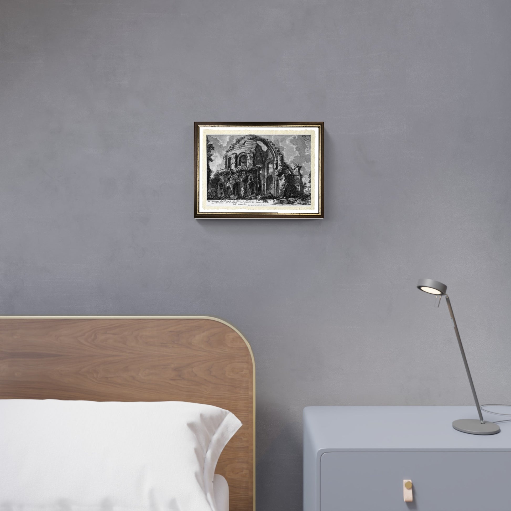 Questa riproduzione del Tempio di Minerva, è un opera del celebre incisore Giovanni Battista Piranesi del 1756. L'incisione rappresenta un importante documento storico-artistico che illustra con precisione e dettaglio le rovine dell'antico tempio, rivelando la maestria tecnica di Piranesi nel rappresentare prospettive architettoniche.