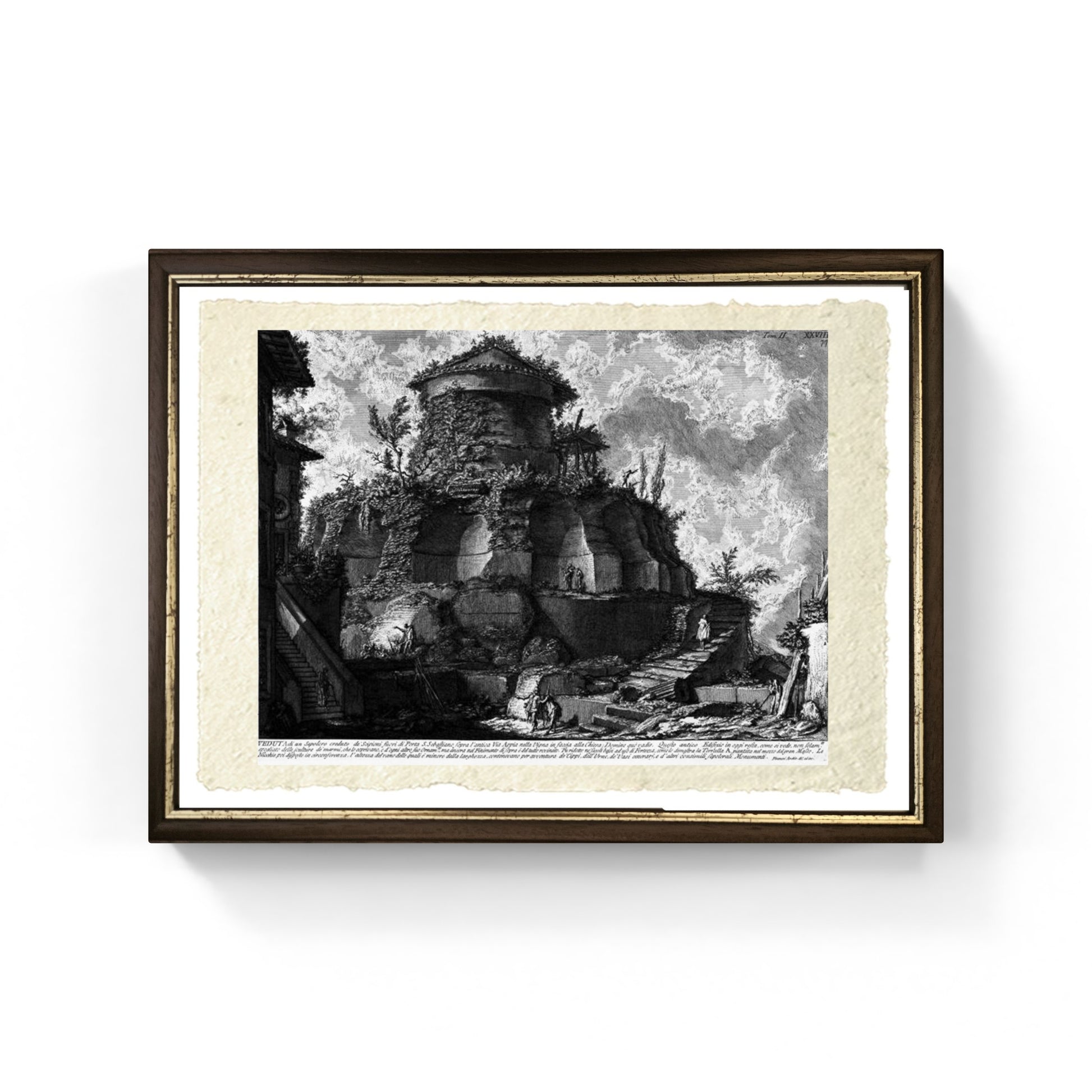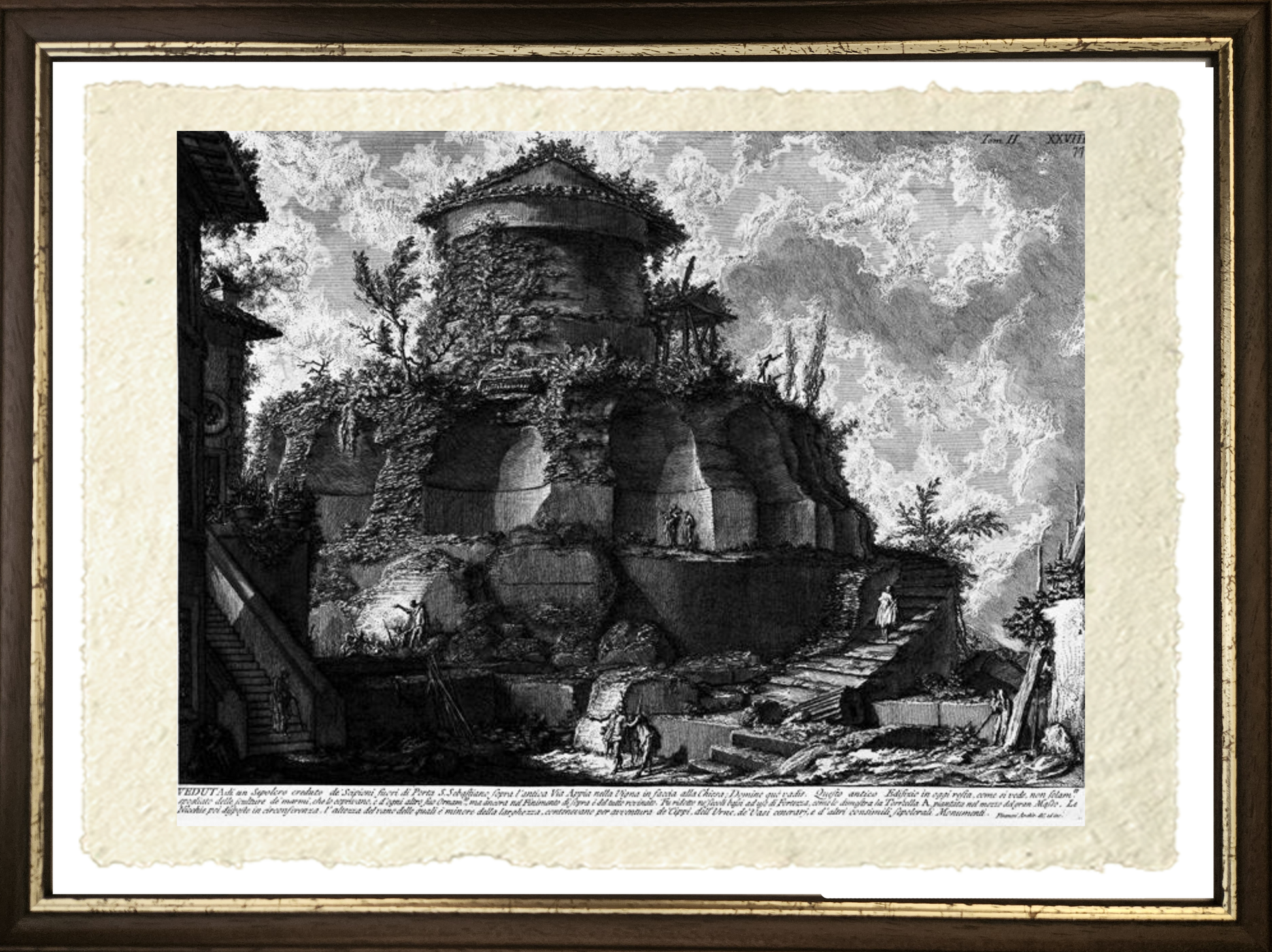 Piranesi infatti, nella sua vasta produzione, incluse molteplici vedute di tombe e mausolei antichi, sia in superficie che ipogei, spesso basate su ricerche archeologiche e rilievi, ma anche sulla sua potente immaginazione.