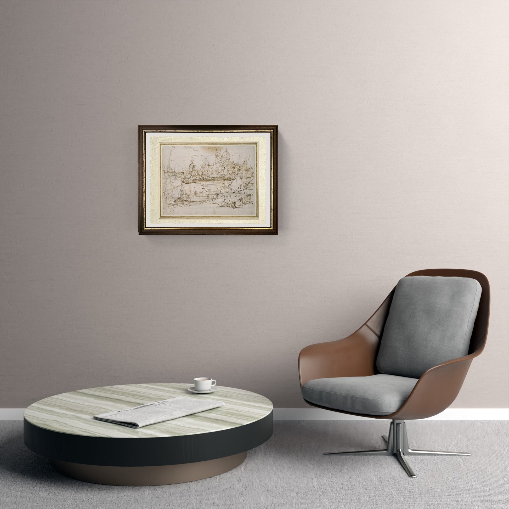 Original and rare 18th-century sketch of the Customs House and St Mary of Health, created by Giovanni Antonio Canal, known as Canaletto, in pen and brown ink over black chalk. In the foreground, we can see the customs landing stage, and nearby, the splendid church of St Mary of Health, with a detail of its large dome. The painting is undated. Another variant of this work by Canaletto exists.