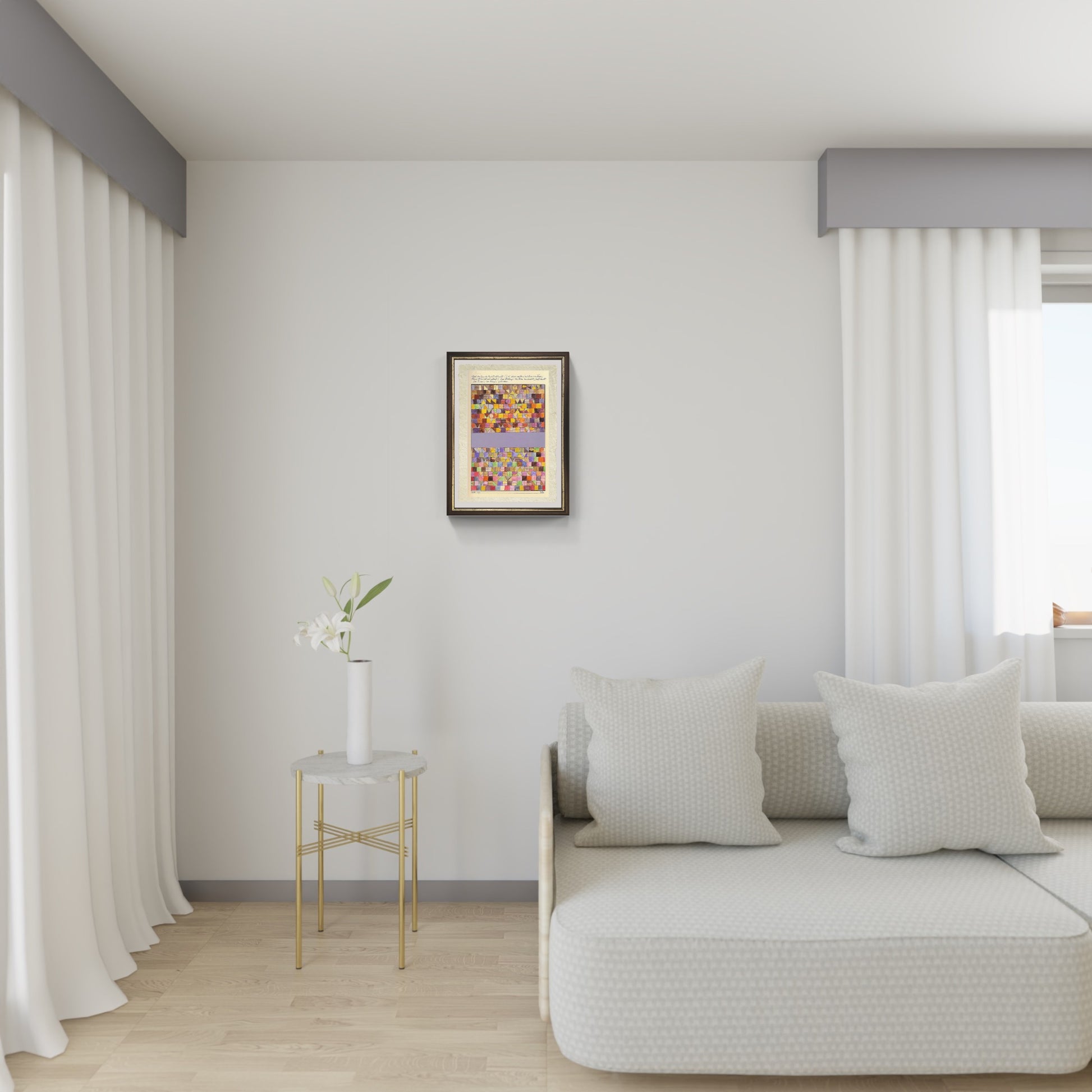 La poesia, scritta in tedesco dallo stesso Klee, recita: "Dapprima innalzatosi dal grigiore della notte, poi pesante e prezioso e reso forte dal fuoco, di sera pervaso da Dio e curvato. Infine etereo avvolto di blu, si libra su campi innevati, verso cieli stellati". Le due strofe sono separate da una striscia argentata. Oggi l'opera è custodita al Centro Paul Klee di Berna.