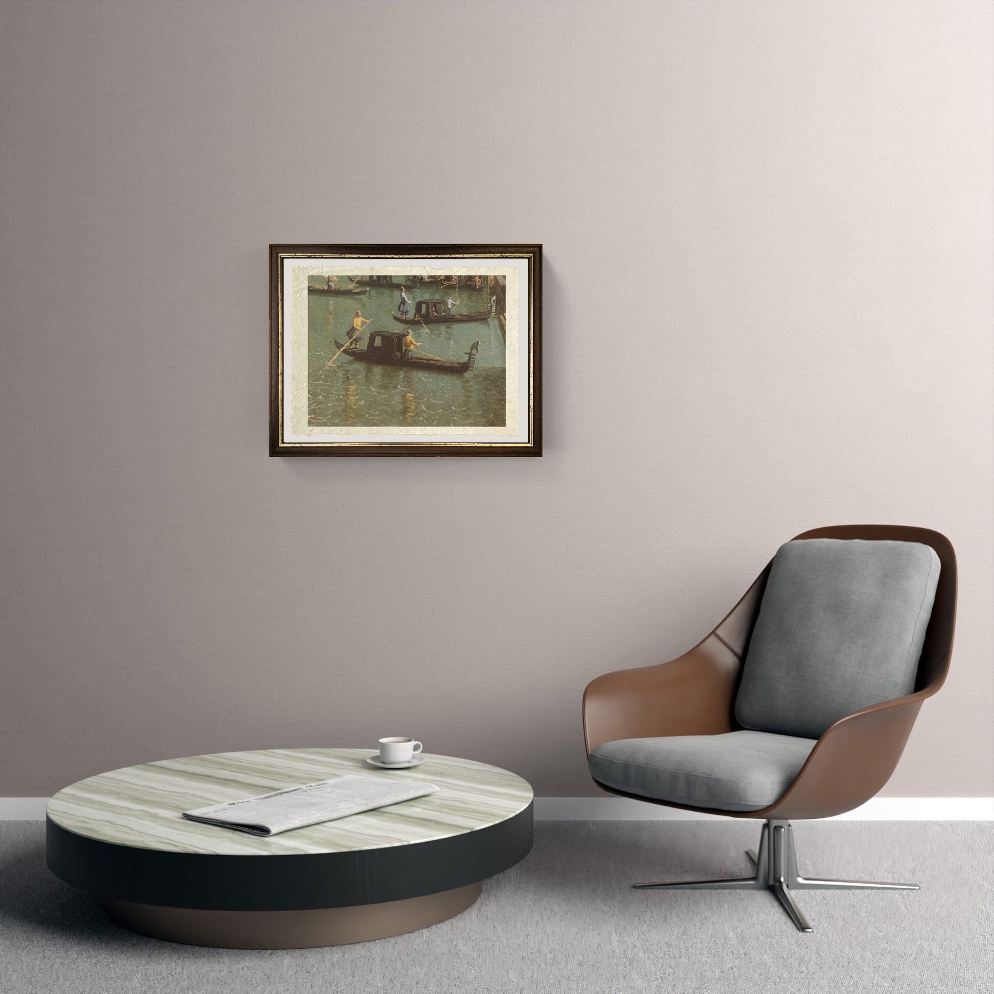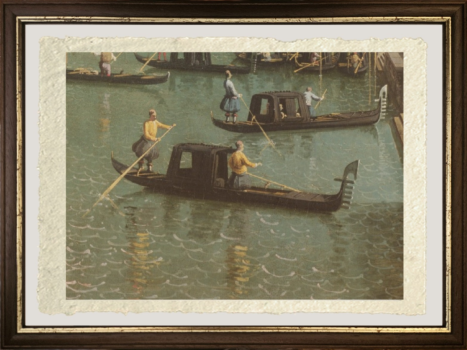 Original and luminous 18th-century view of a detail of the Grand Canal, with two gondolas, by Giovanni Antonio Canal, known as Canaletto. The water is painted in shades of blue-green, with a mirrored effect for the silhouettes of the two gondolas. A distinctive feature of the painting are the covered gondolas, typical of the 18th century, which are no longer used today and have been replaced by open-air gondolas. The painting, an oil on canvas, is undated.