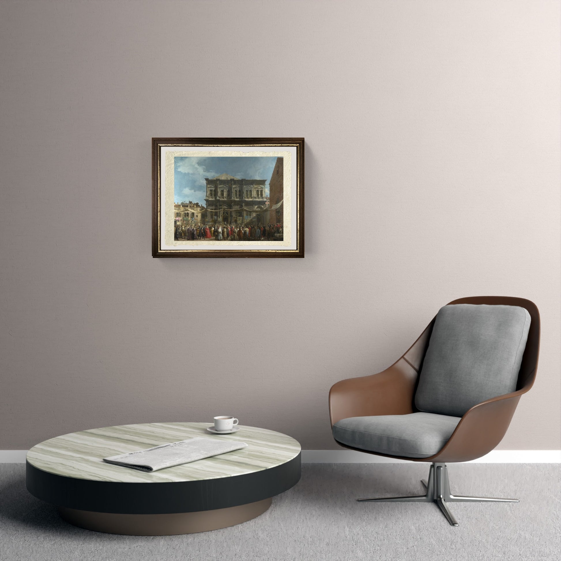 Original and rare 18th-century view of the feast of San Rocco in Venice, painted by Giovanni Antonio Canal, known as Canaletto. In the foreground there are Venetian nobles, dressed in their colorful and exquisite robes. Further in the background there is the Venetian palace, painted by Canaletto with architectural details. The sky is clear, with a few white clouds on the horizon.