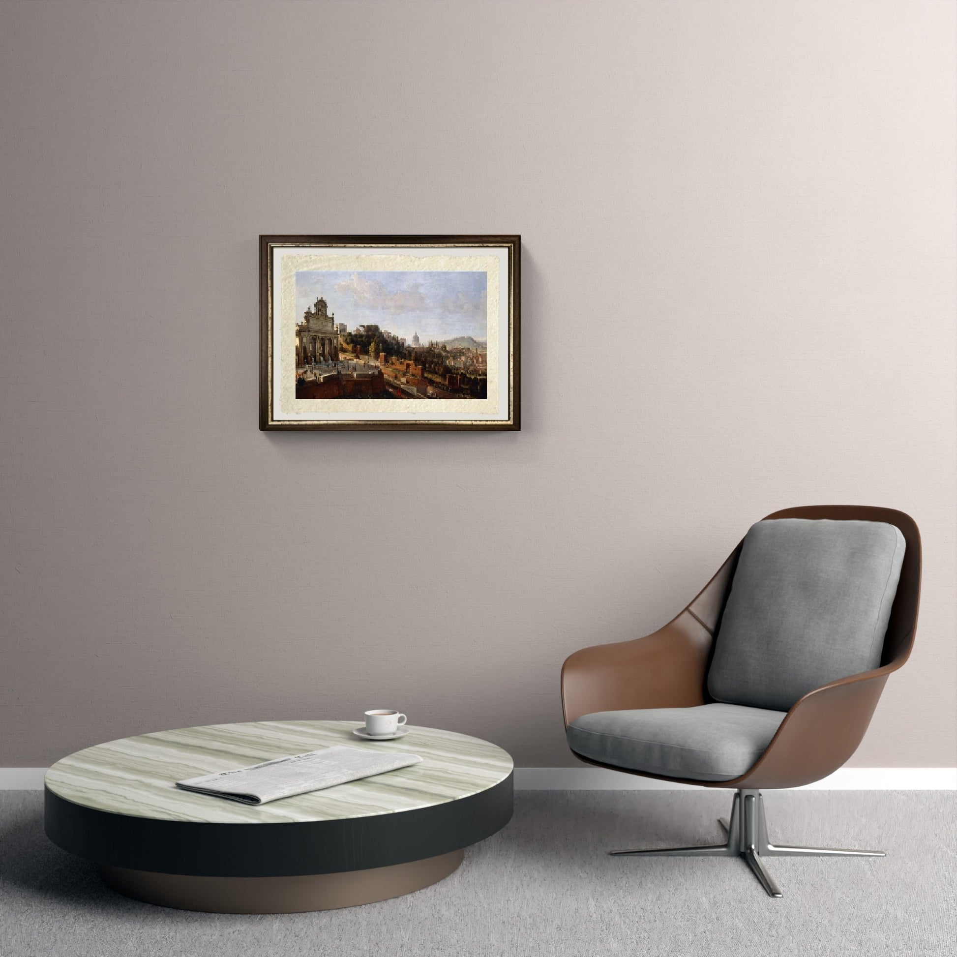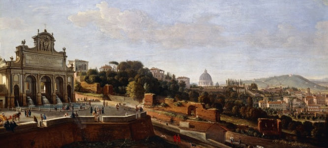 A rare historical view of the Fontana dell'Acqua Paola in Rome, painted by Gaspare Vanvitelli. The fountain on the hill is the main feature of the painting, from which the citizens surrounding it draw water. The dome of St. Peter's is depicted in the background, along with the other hills of Rome.