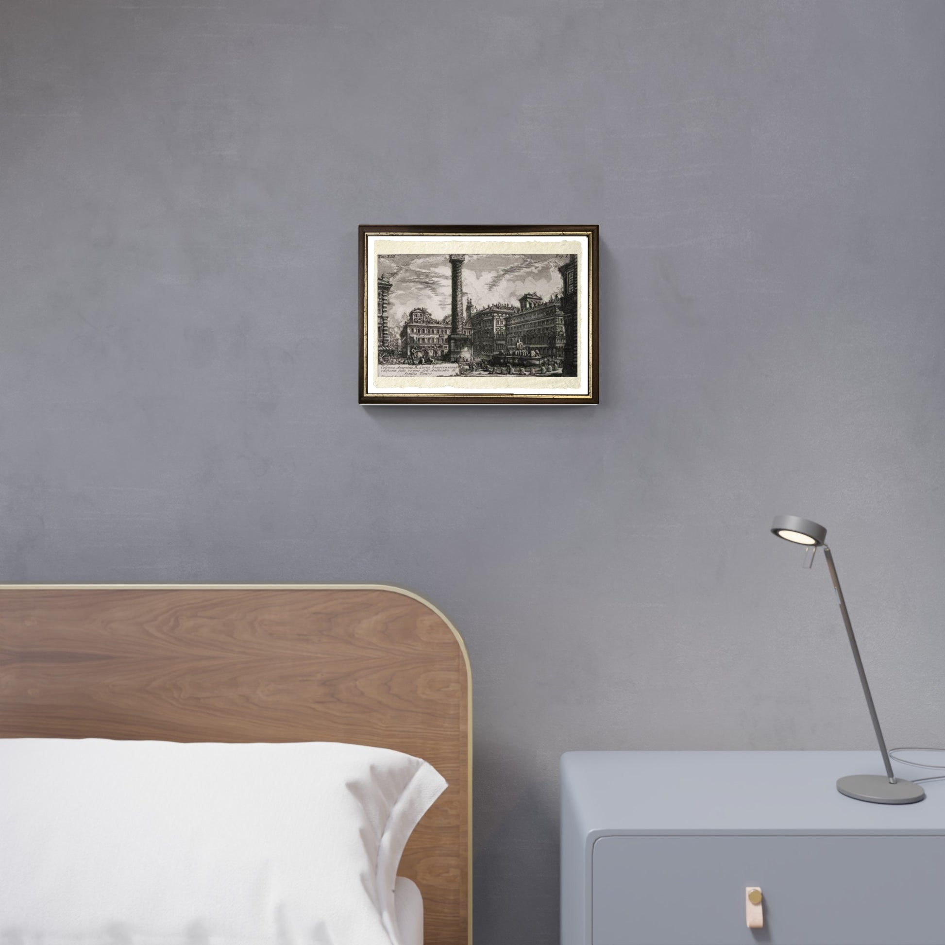 L'incisione di Giovanni Battista Piranesi del 1756 raffigura la Colonna Antonina (o Colonna di Marco Aurelio) affiancata dalla Curia Innocenziana, offrendo uno spaccato significativo del panorama urbano di Roma nel XVIII secolo e della visione artistica di Piranesi.