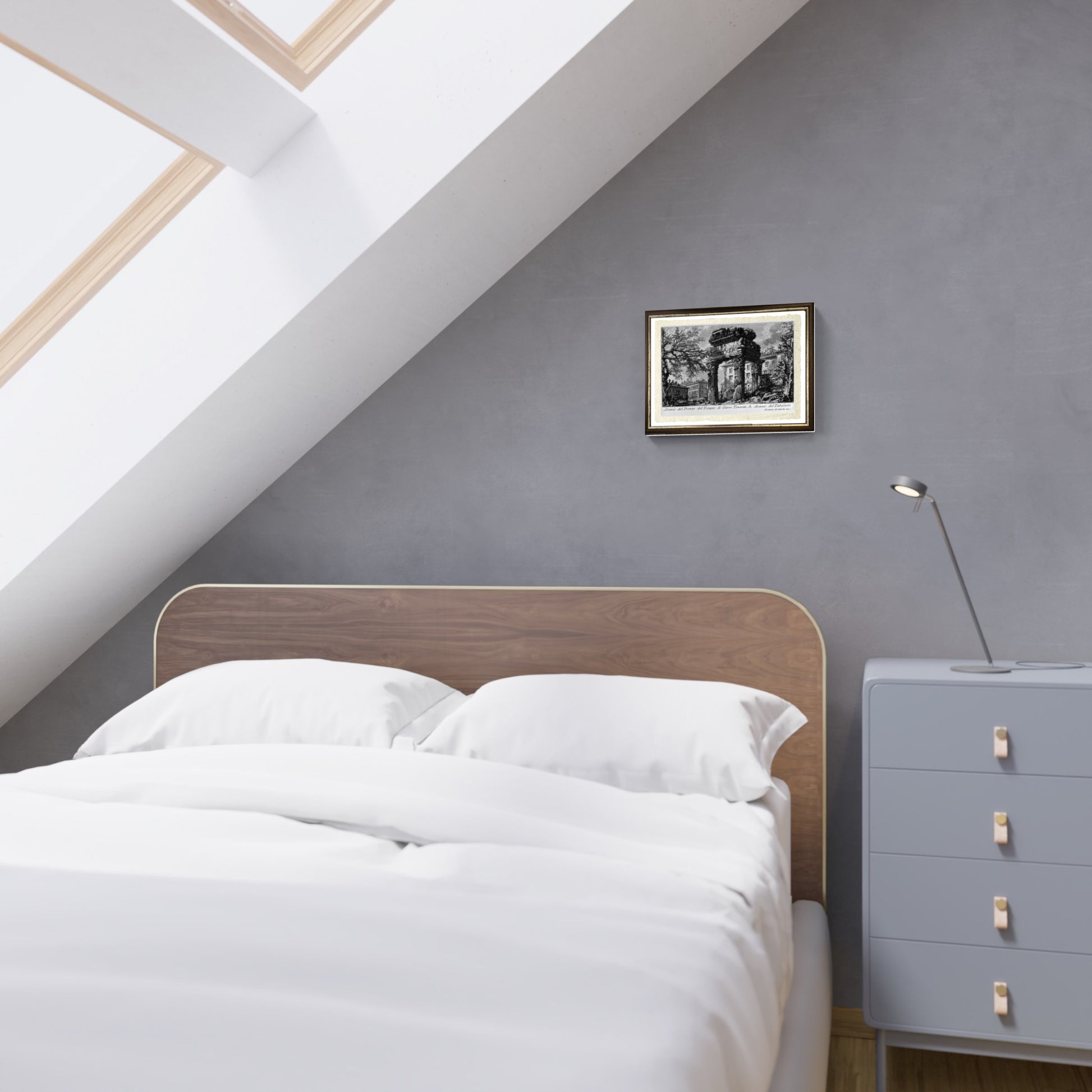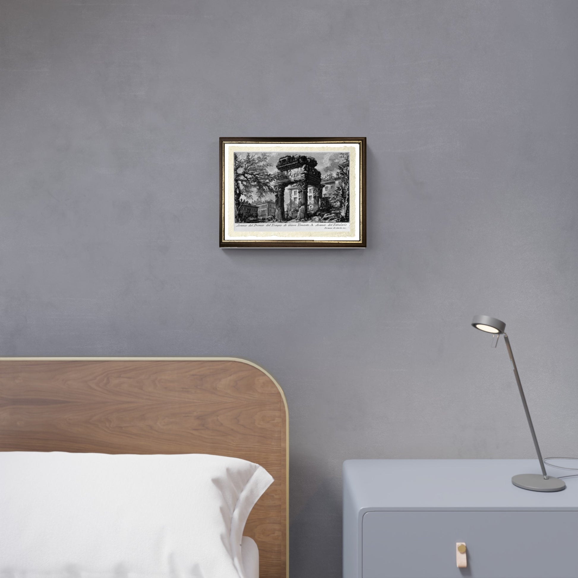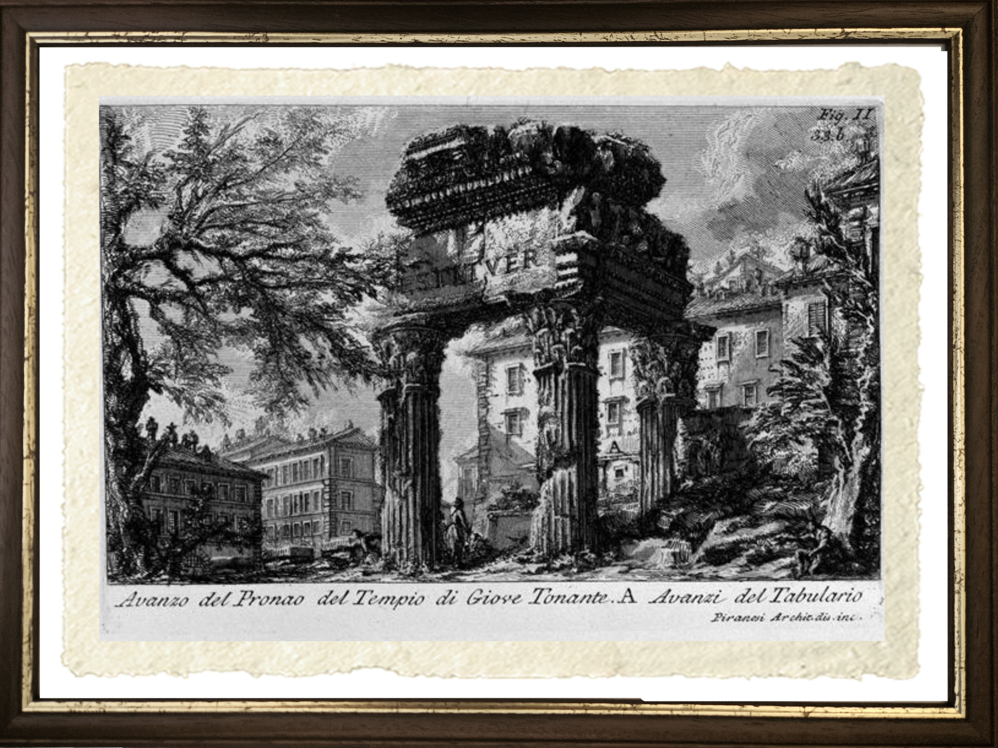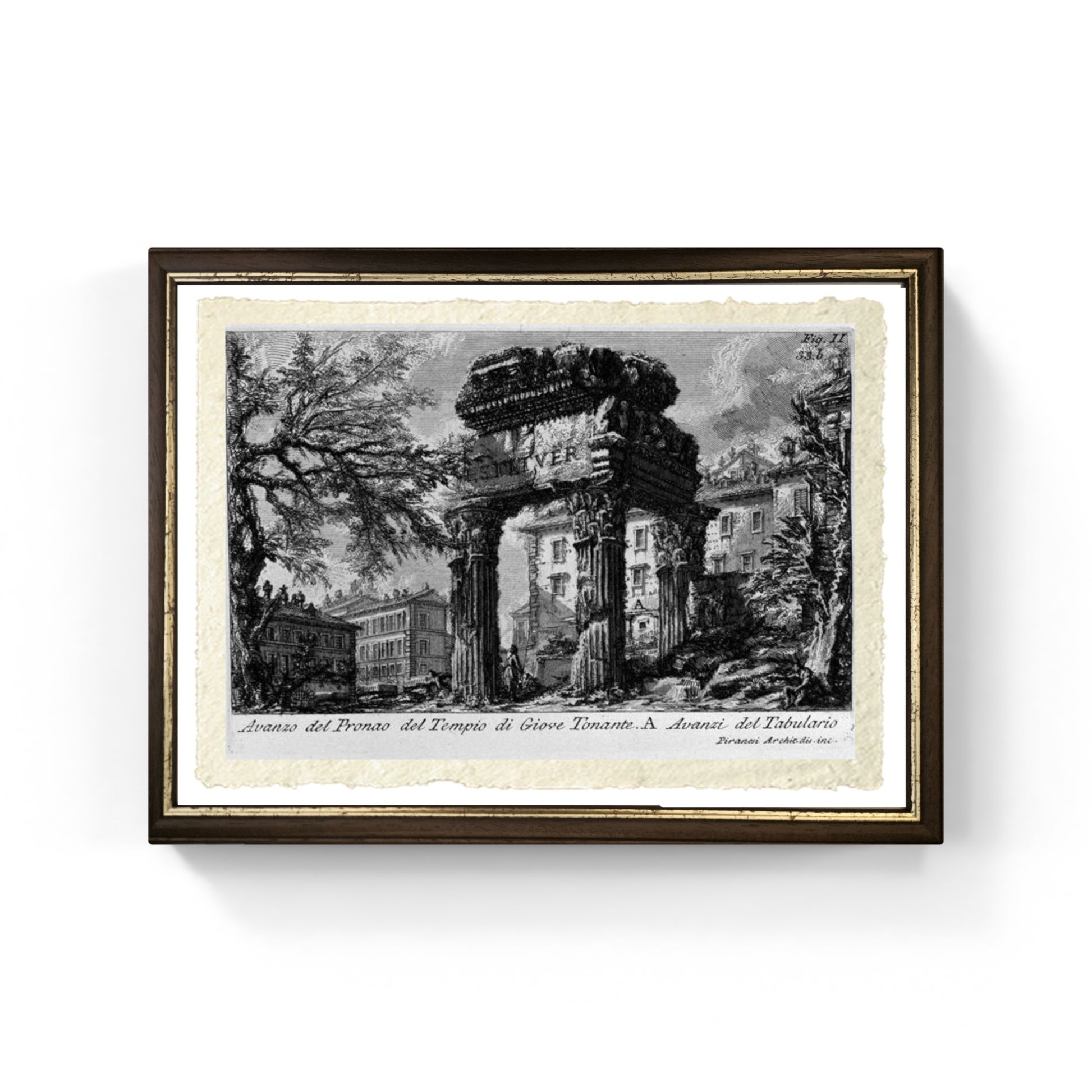 Questa riproduzione del "Tempio di Giove Tonante" è una splendida opera di Giovanni Battista Piranesi del 1756. Questa veduta fa parte della sua celebre e influente serie "Le Antichità Romane" (in quattro volumi), pubblicata proprio in quell'anno.