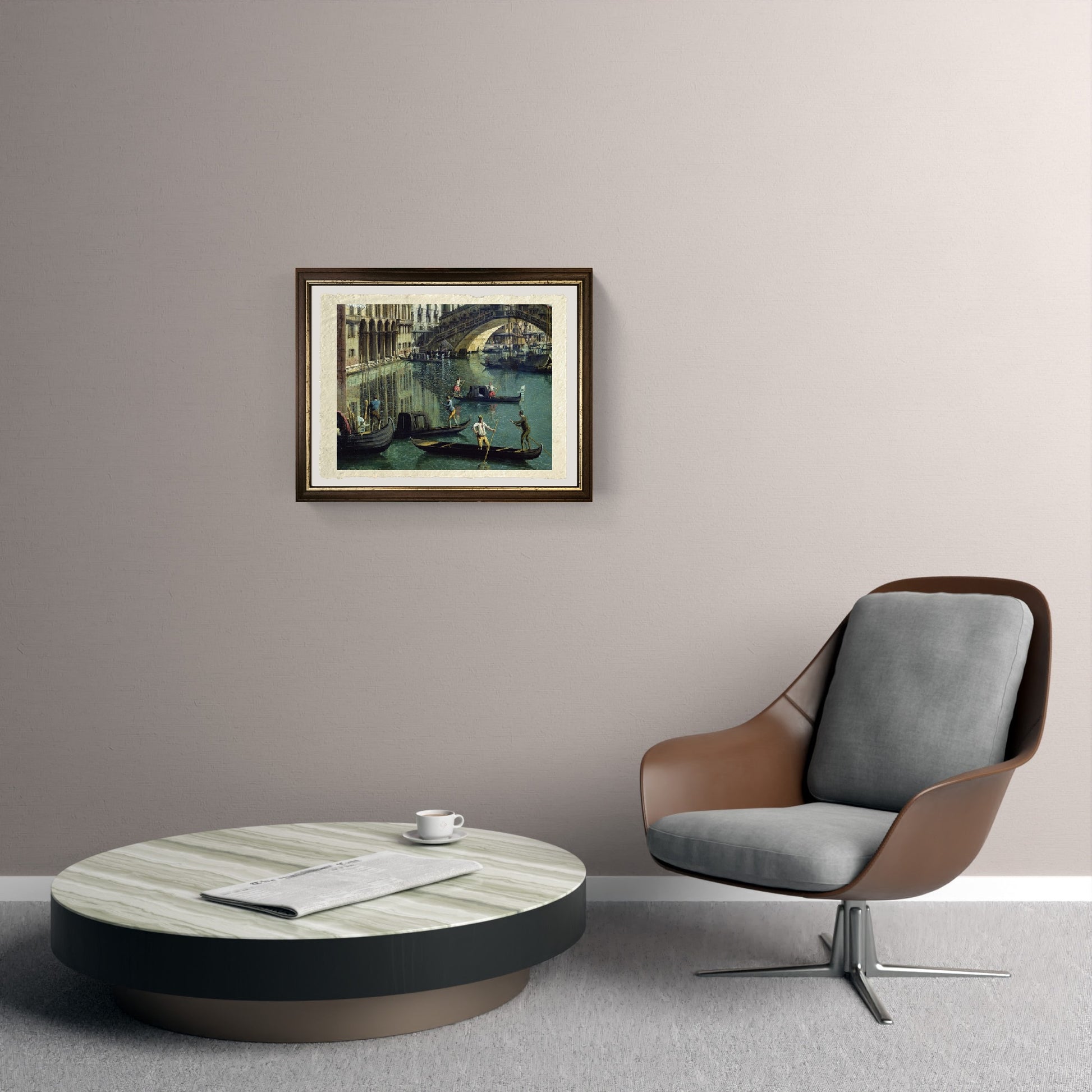 Original 18th-century view of gondoliers near the Rialto Bridge, painted by Giovanni Antonio Canal, known as Canaletto. In the foreground, the gondoliers are navigating, introducing tourists to Venice. The day is clear, and the sky is reflected in the water with shades of light green and blue. Behind the gondolas, a section of the Rialto Bridge can be seen. On the bank on this side of the canal, Venetian palaces are reflected in the water.