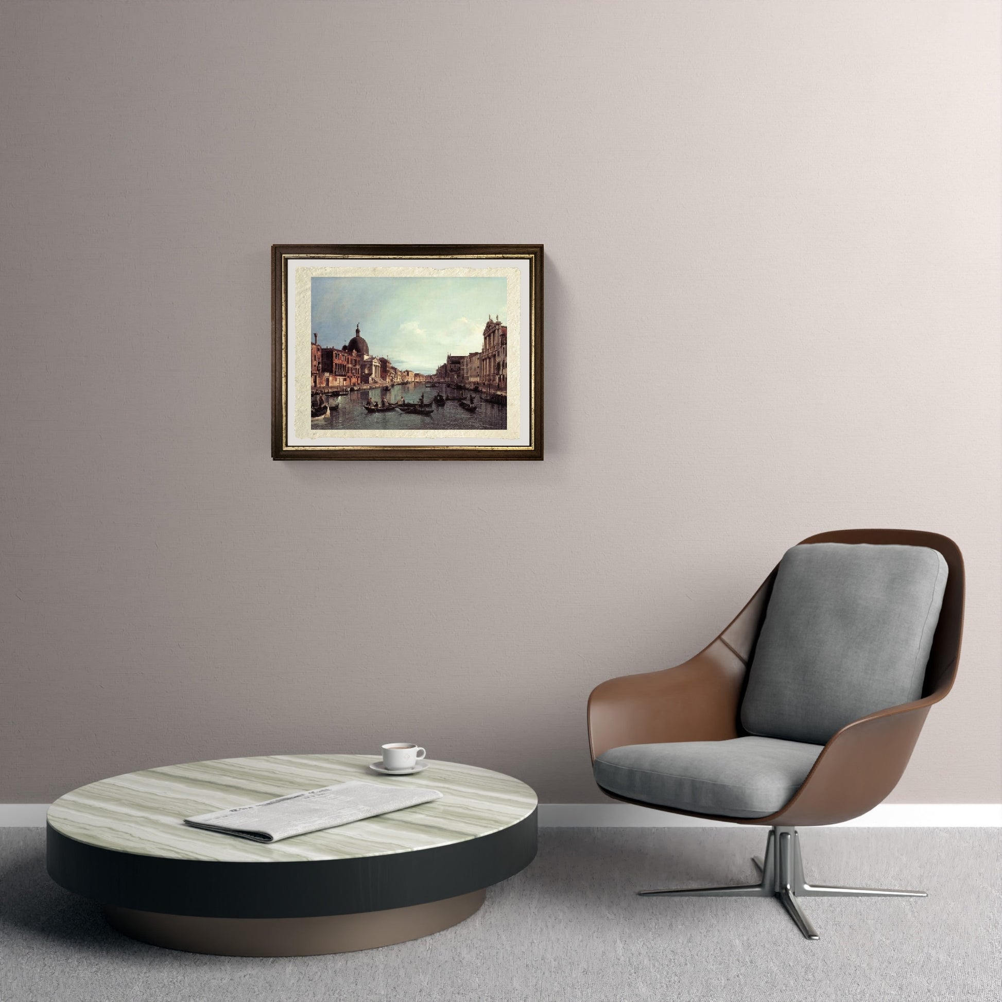 Original 18th-century view of the Grand Canal, painted by Giovanni Antonio Canal, known as Canaletto. In the foreground there is the Grand Canal, with freight boats gathered together and others navigating. The canal water takes on blue-green reflections. Venetian palaces are depicted on the canal banks, arranged side by side, some in the shadow. The sky is cloudy.
