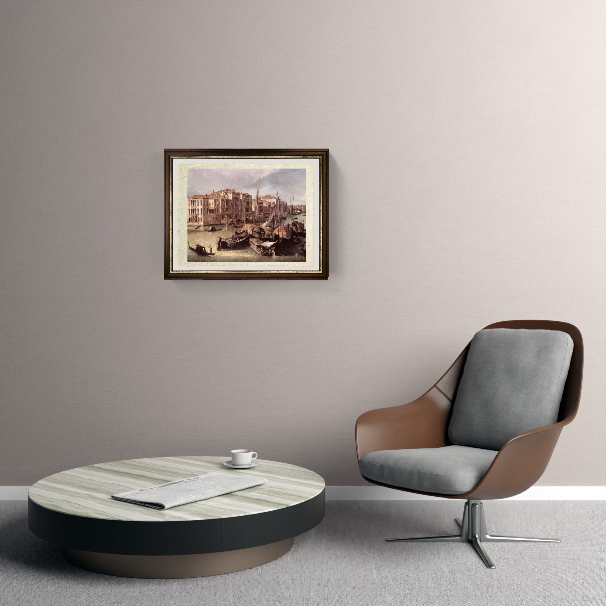 Original 18th-century view of the Grand Canal, with a unique use of light, painted by Giovanni Antonio Canal, known as Canaletto. In the foreground there is the Grand Canal, with freight boats gathered together and others navigating. The canal water is brightly lit on the left side of the painting, almost taking on a light brown hue, while on the opposite side it takes on the usual light green-blue hue. Beyond the canal bank there are Venetian palaces, arranged side by side and in shadow. The sky is cloudy, with leaden clouds depicted on the entire painting.