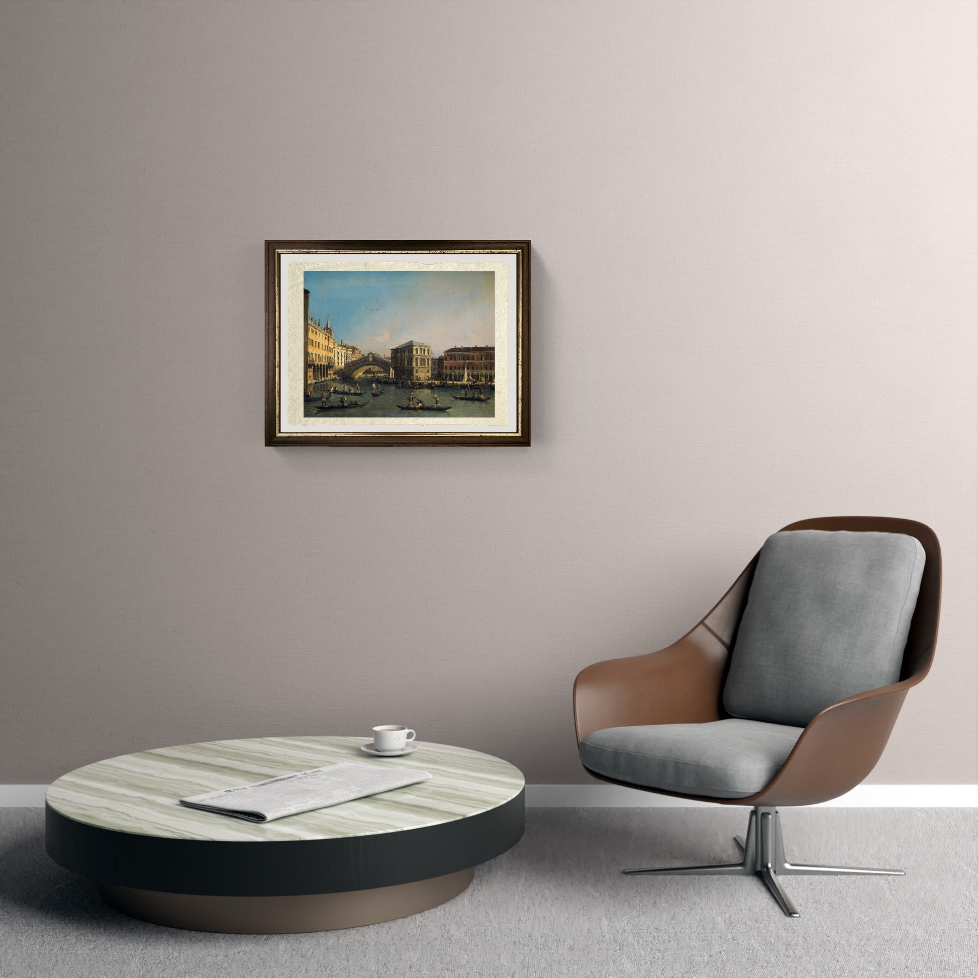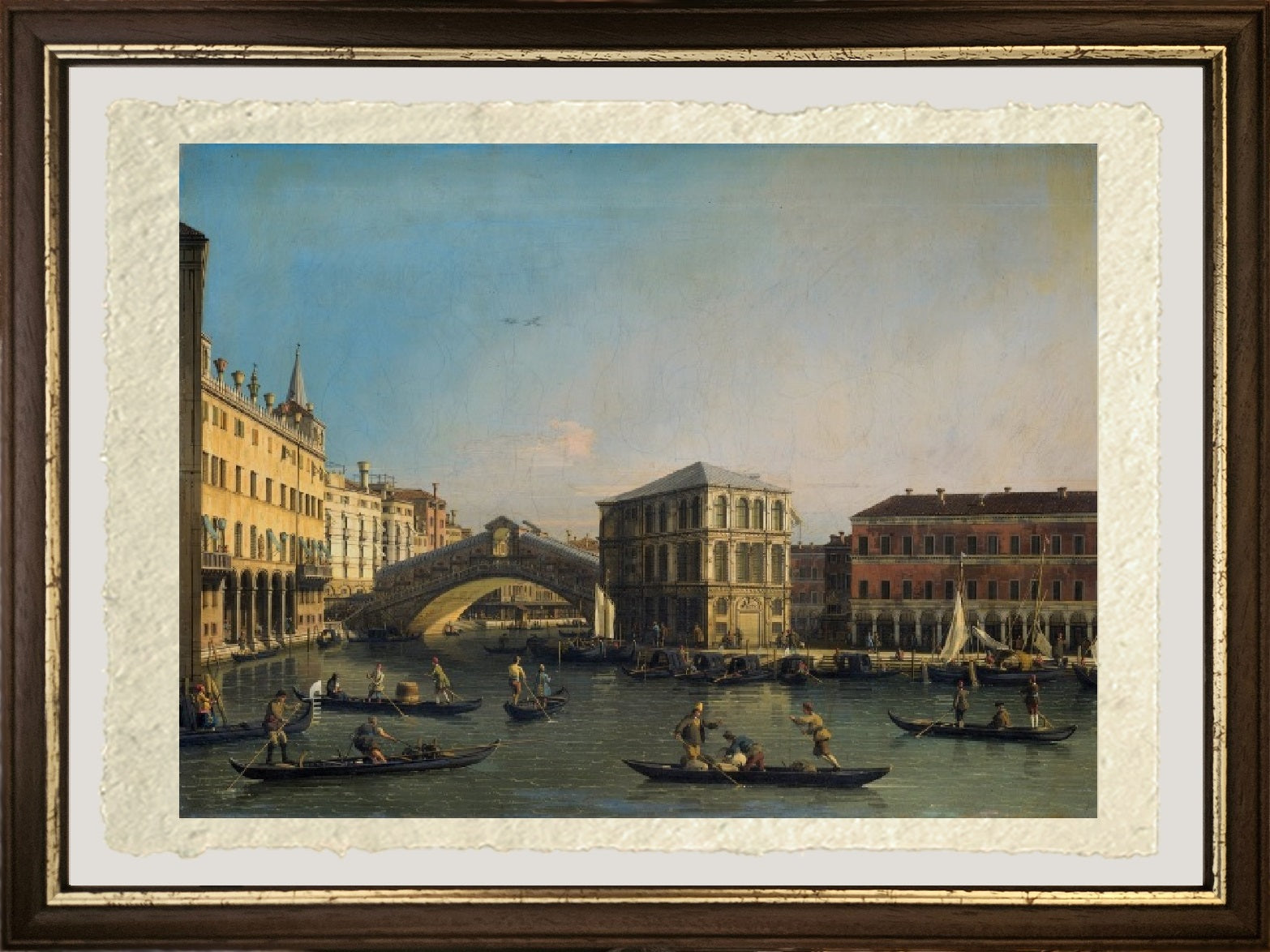Original and rare 18th-century painting of the Rialto Bridge, by Giovanni Antonio Canal, known as Canaletto. In the foreground is the Grand Canal, bustling with boats, surrounded by beautiful Venetian palaces. Canaletto paints the canal water with shades of blue-green, taking on a color similar to that of the sky. Further in the background is the covered Rialto Bridge, with its shops, a focal point for Venetians, just as a shopping center today was in its day. The sky is clear, tinged with pale blue and light pink, with a few clouds.