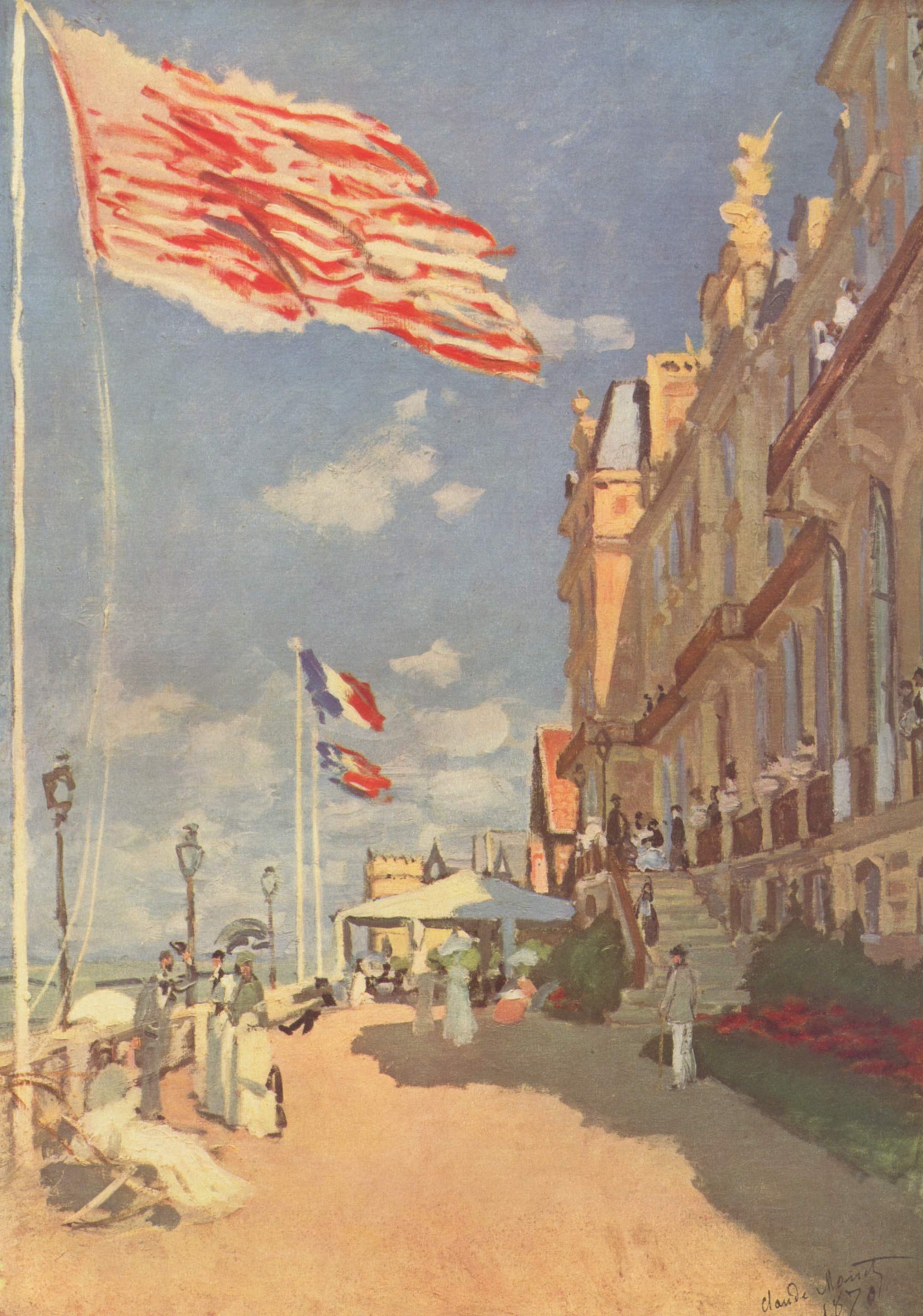 Trouville-sur-Mer, a seaside resort in Normandy, was a popular destination for artists and the bourgeoisie in the 19th century. Monet stayed there on several occasions, often working en plein air to capture the immediacy of his impressions. This painting, in particular, seems to focus on the building of the Hotel des Roches Noires, which at the time was an imposing and fashionable structure on the coast.