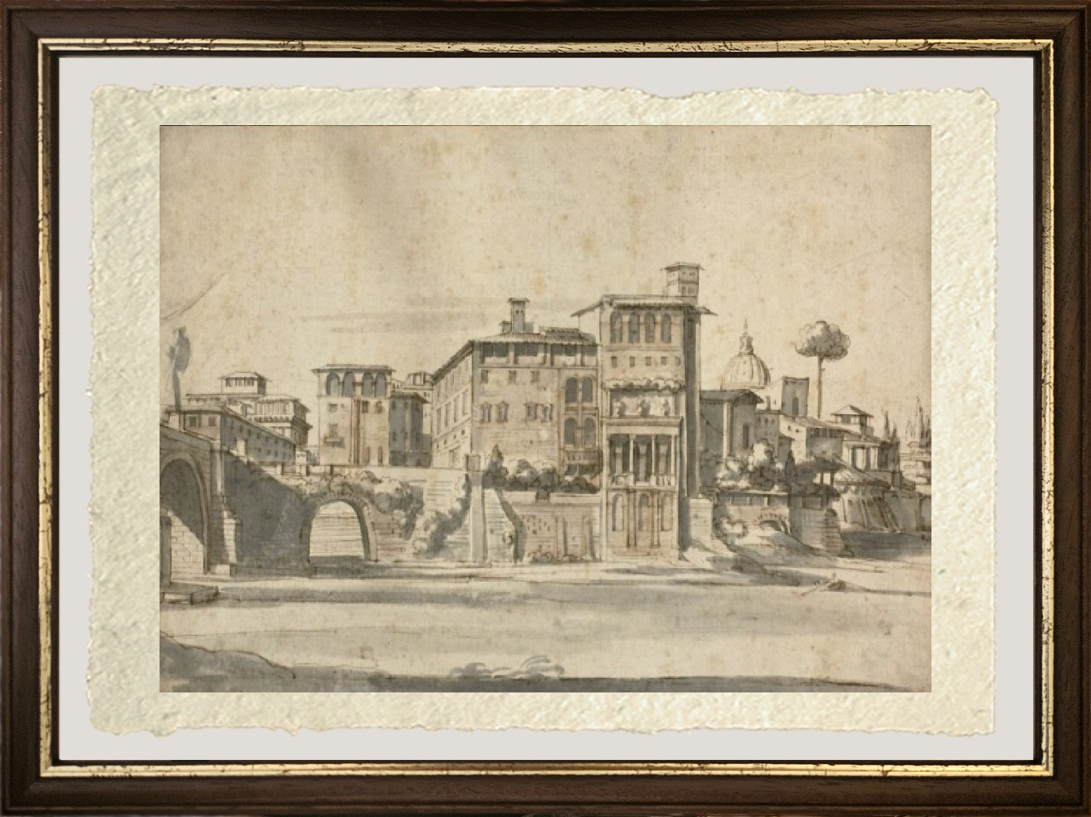 A refined historical view of some houses on the Tiber River by Gaspar Van Wittel, featuring strong chiaroscuro effects. The dominant color is brown with many shades. The houses are on the opposite side of the Tiber bank from the viewer, with a bridge drawn on the left. The dome of St. Peter's can be glimpsed in the background.