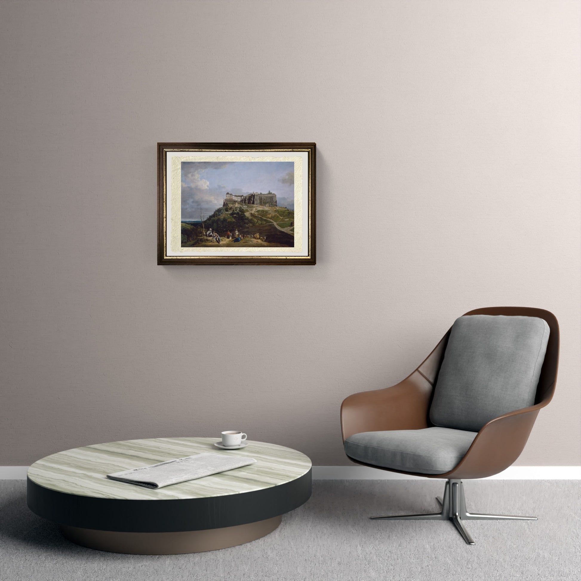 A luminous and original painting depicting the Königstein fortress on the rock, painted by Bernardo Bellotto. The fortress and the winding road leading to it are prominent. In the foreground, Bellotto depicts shepherds taking a break. The sky is cloudy and leaden, but a ray of light illuminates the shepherds. One of the dominant colors in the painting is green, which Bellotto has masterfully blended. There are four other variations of this painting, each with different lighting.