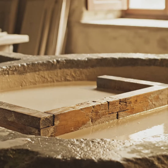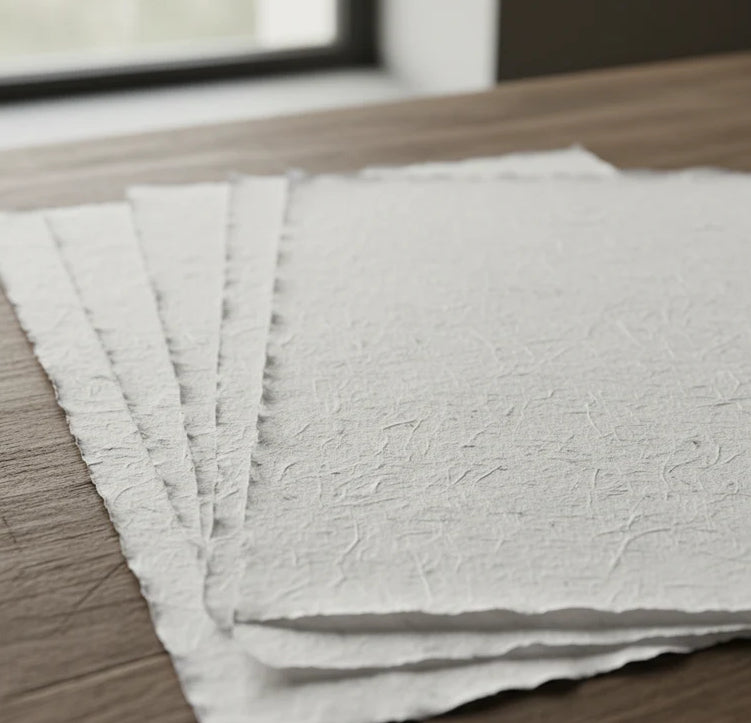 It is a paper made exclusively from cotton fibers, thick and naturally porous, yet soft to the touch, with characteristic deckled edges that bear witness to its artisanal craftsmanship.