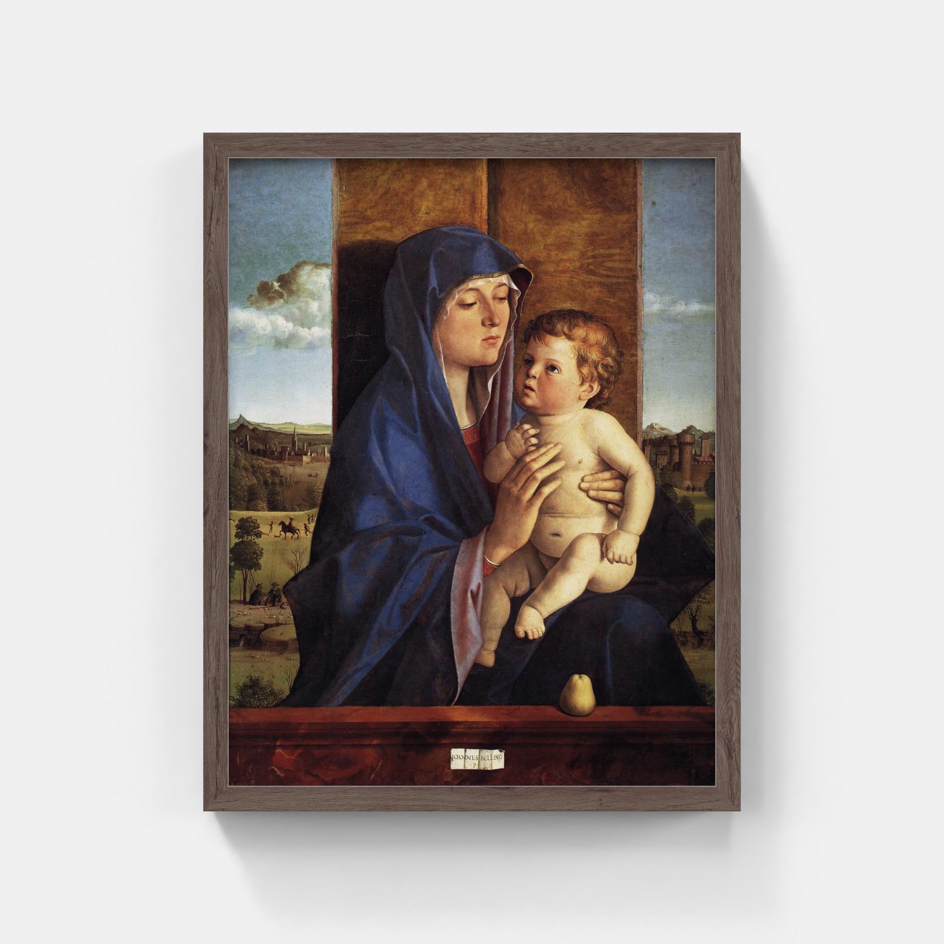 The Madonna of Alzano by Giovanni Bellini, also called Madonna della Pera or Madonna Morelli (from the name of the last owner), was created around 1485-1490 and represents the Madonna and Child in an atmosphere of intense spirituality. The Madonna turns her meditative gaze to the Child, referring to the future sacrifice, but there is no typical tragic dimension. Indeed, the rural landscape behind the two characters conveys serenity, it is dotted with villages and other figures are visible, and is perhaps to be attributed to another painter. Bellini, master of the Venetian Renaissance, demonstrates remarkable skill in the use of light and color, giving the figures an extraordinary softness and realism.