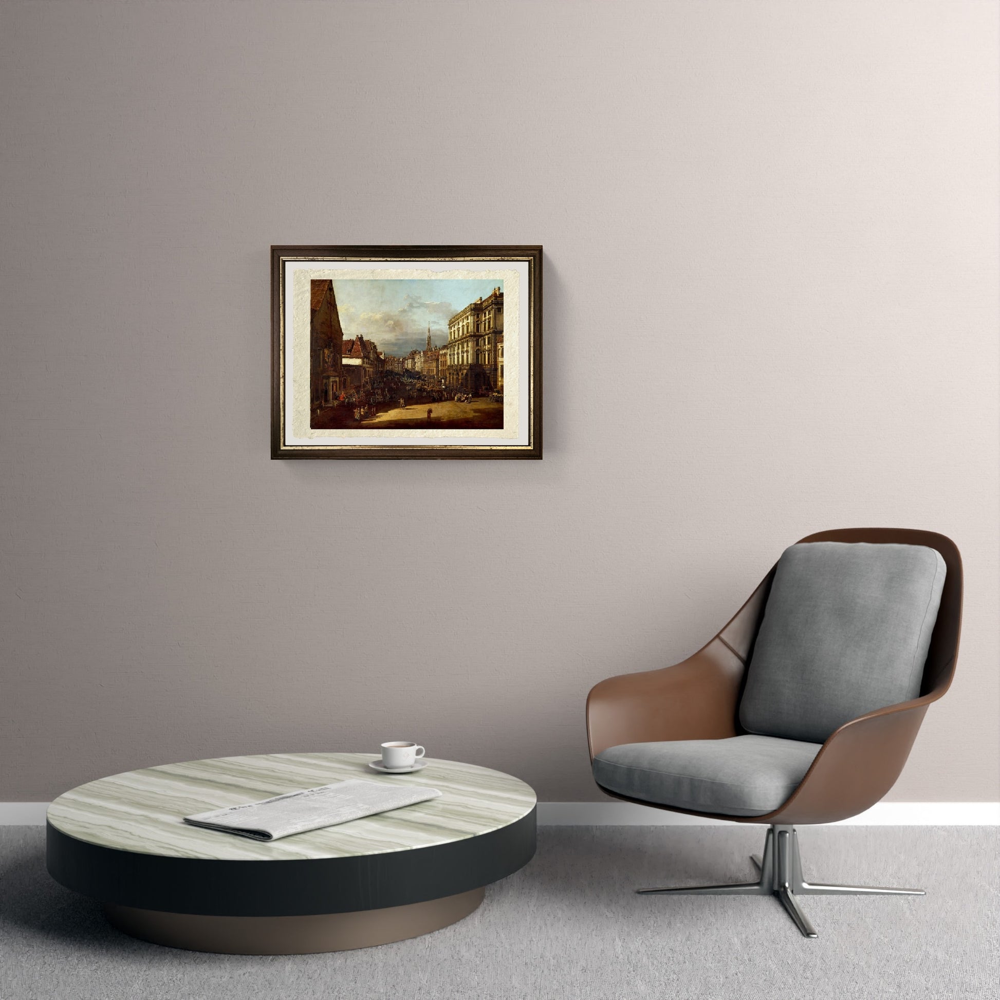 Interesting historical view of the Flour Market in Vienna, painted by Bernardo Bellotto. The square with a market in progress is prominent, crowded with people looking for a bargain. Beautiful buildings surround the square, while the church is further in the background. The sky is clear with a few clouds. The painting, an oil on canvas, is undated. There are six other variations of this work by Bellotto.