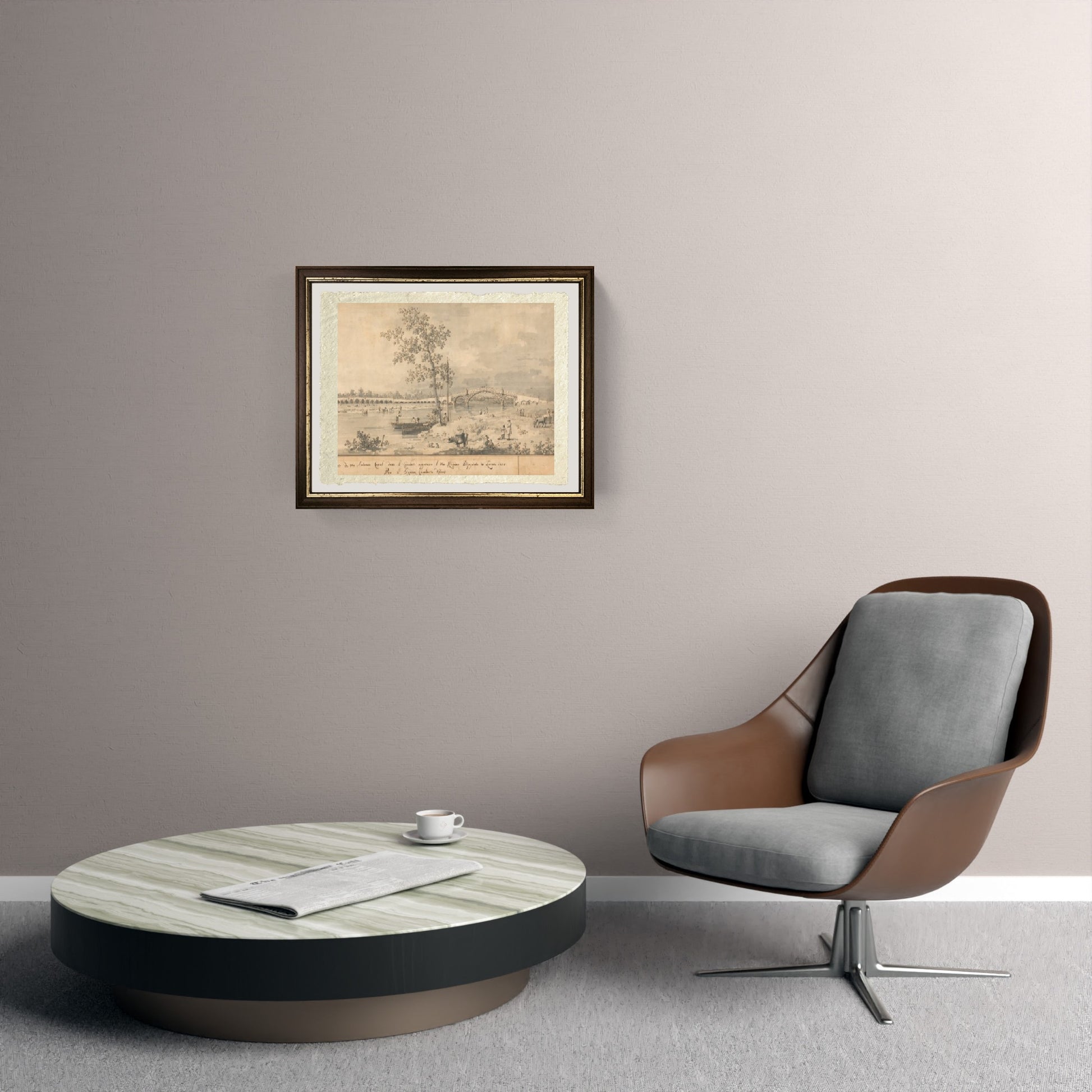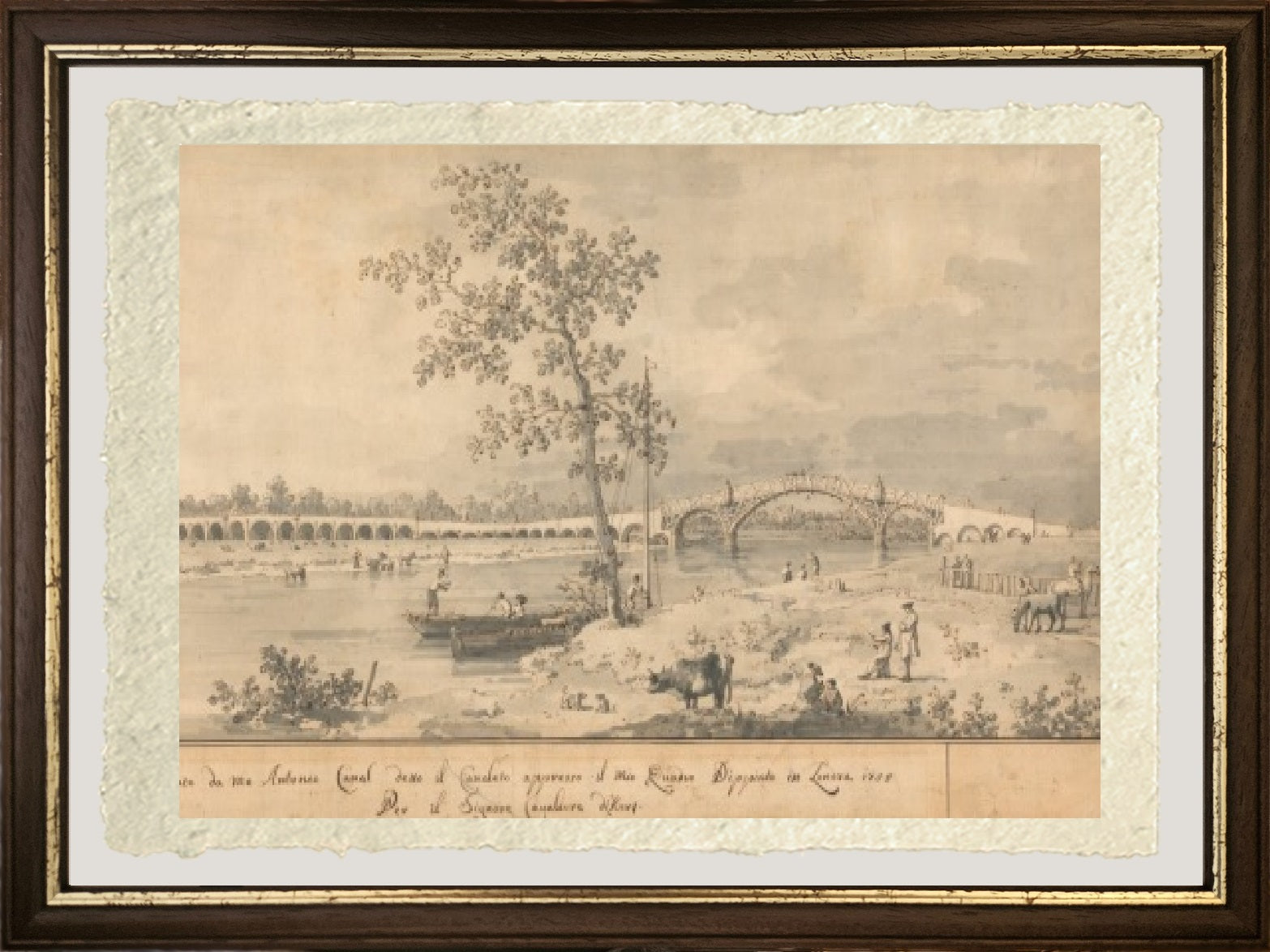 Original and luminous eighteenth-century engraving of Walton Bridge, created by Giovanni Antonio Canal, known as Canaletto, in ink on paper. Highlighted on the right side there is the bridge with its first large arch, followed by smaller ones, connecting the opposite bank of the Thames. There are some boats in the river, while on the bank to the right of the painting there are scenes of everyday life. The large tree is depicted in the center, leaning in the wind. The sky features light clouds on the horizon, but the day remains clear.