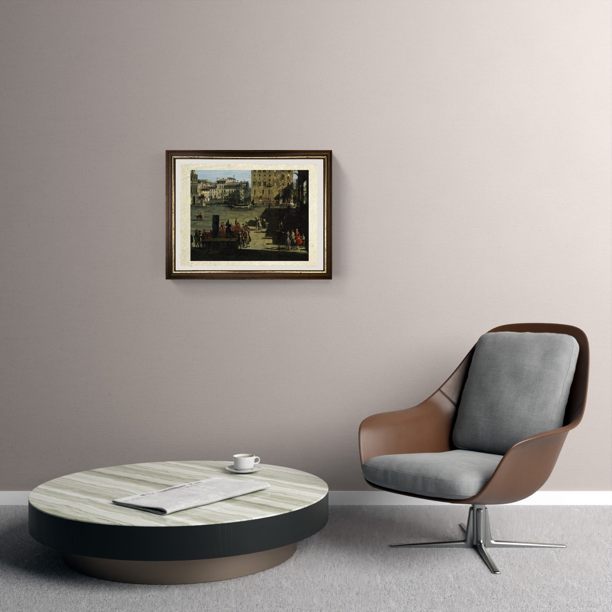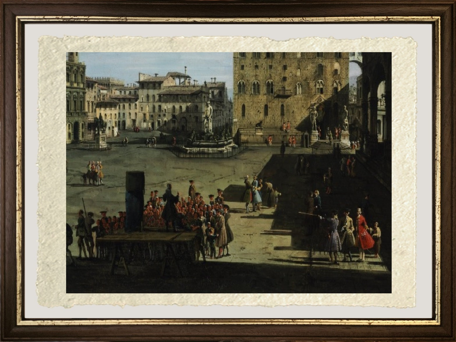A bright and original view of a portion of Piazza della Signoria in Florence, painted by Bernardo Bellotto. The Palazzo Vecchio is seen from afar, while the square itself features the David and other statues. In the foreground are scenes of daily life in the square. Around it, arranged side by side, there are the Florentine palaces. The sky is clear with a few scattered clouds. The painting, an oil on canvas, is dated 1740.