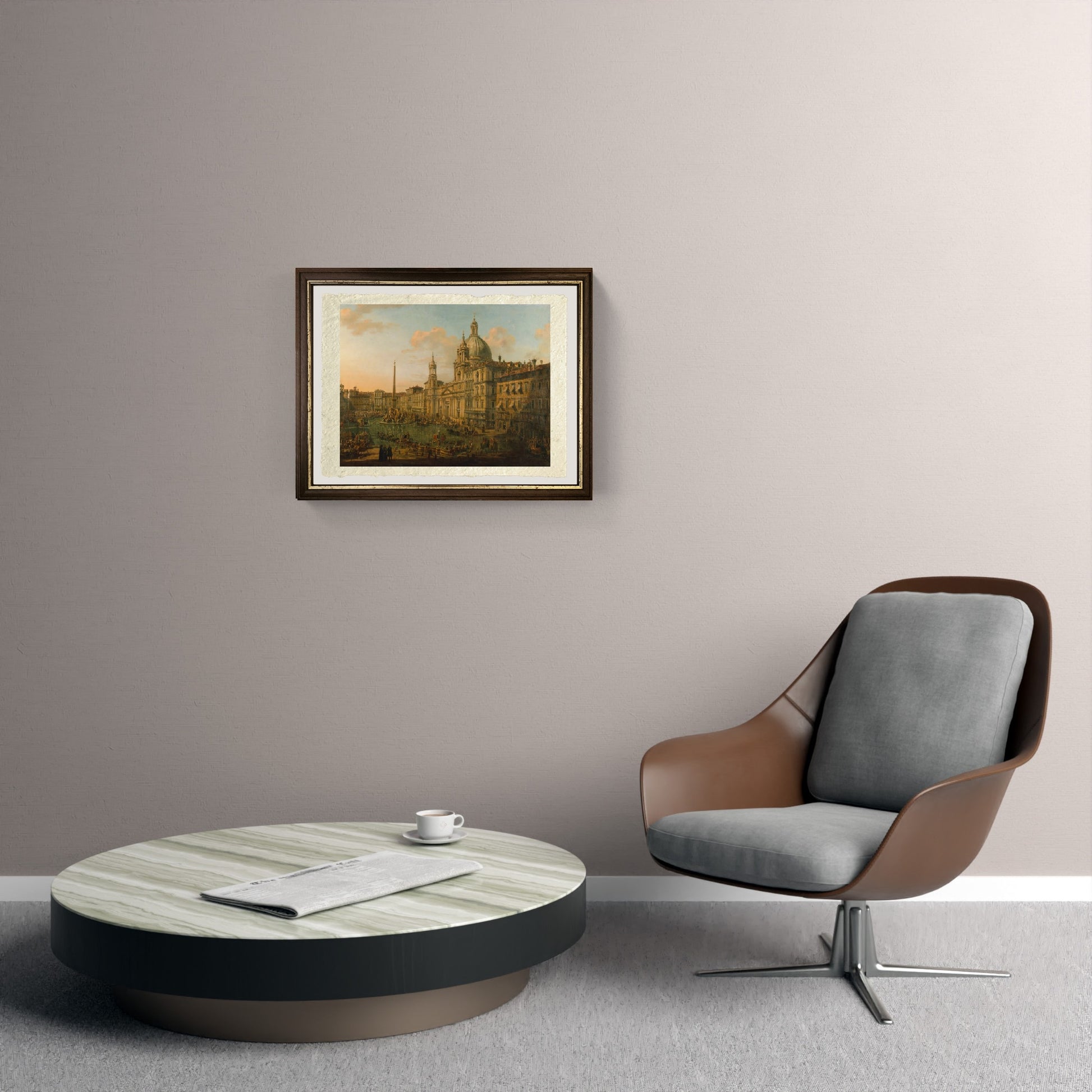 Original and unusual eighteenth-century view of Piazza Navona in Rome, flooded by water, painted by Bernardo Bellotto. On the right there is the large church, flanked by buildings. In the center of the square there is the obelisk, surrounded by water, with a detail of horses pulling carriages racing across the water formed after a heavy downpour. The sky is clear, light blue tinged with pink, with a few clouds, and the city is trying to resume its daily life after the heavy rainfall. The painting, an oil on canvas, is undated.