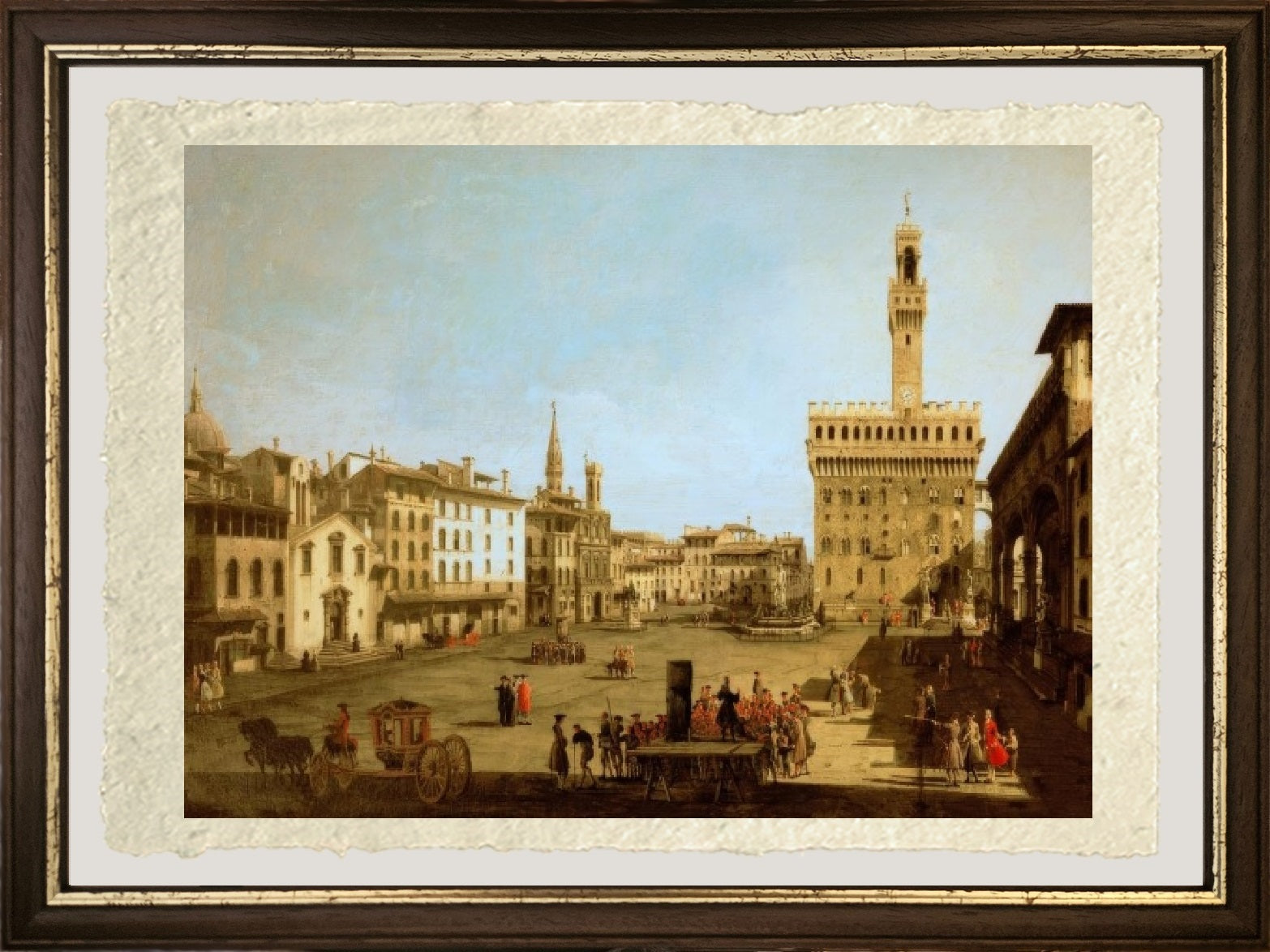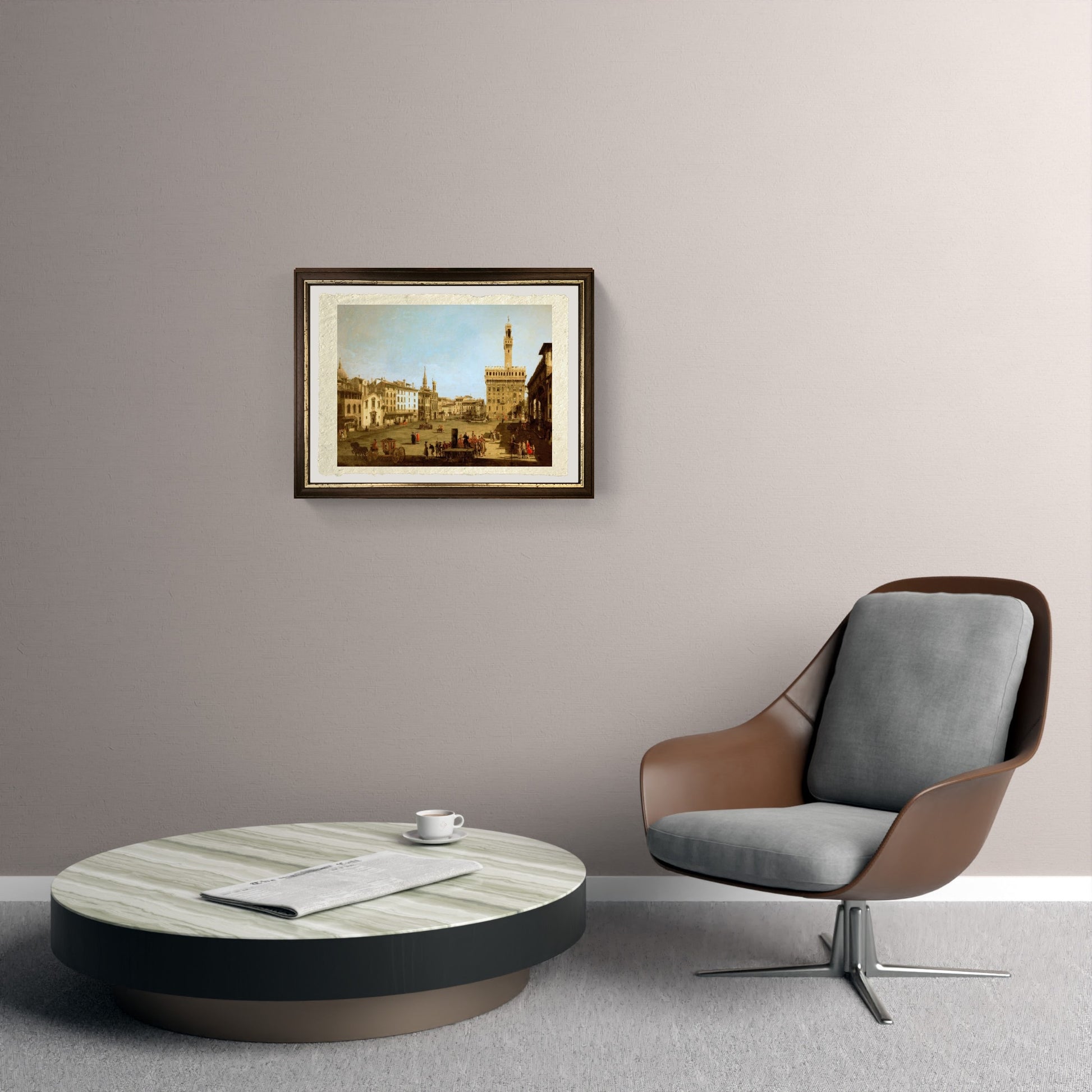 A bright and original view of Piazza della Signoria in Florence, painted by Bernardo Bellotto. Palazzo Vecchio, from afar, dominates the scene with its tall bell tower. Elegant buildings overlook the square, bustling with people looking for bargains. The sky is clear with a few scattered clouds. The painting, an oil on canvas, is dated 1742. Three other variations of this work exist.
