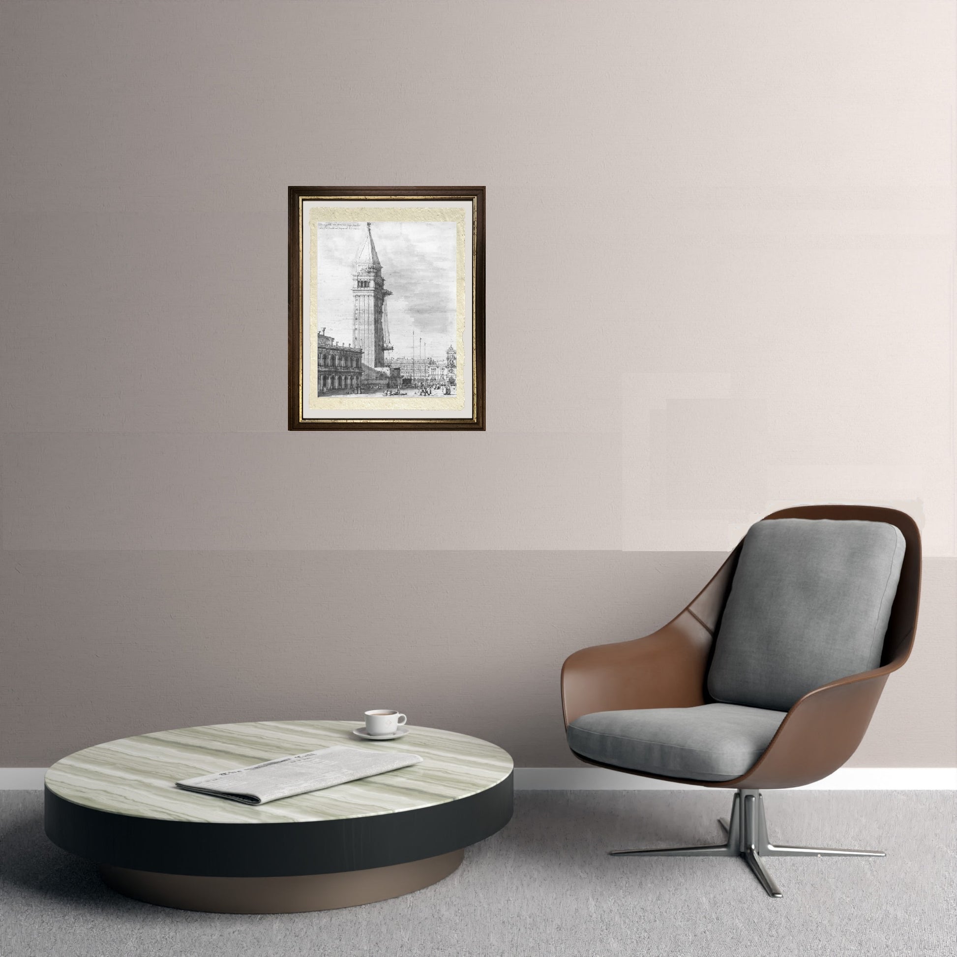 A rare 18th-century engraving of the repairs of the bell tower of San Marco in 1745, created by Giovanni Antonio Canal, known as Canaletto, using pen and ink with watercolor on paper. The large bell tower stands out, with its scaffolding and ropes to lift materials, while passersbys in the square observe the work. There is great excitement, and the work is progressing rapidly, with pulleys lifting the materials. On the right, the clock tower and other Venetian palaces are visible.