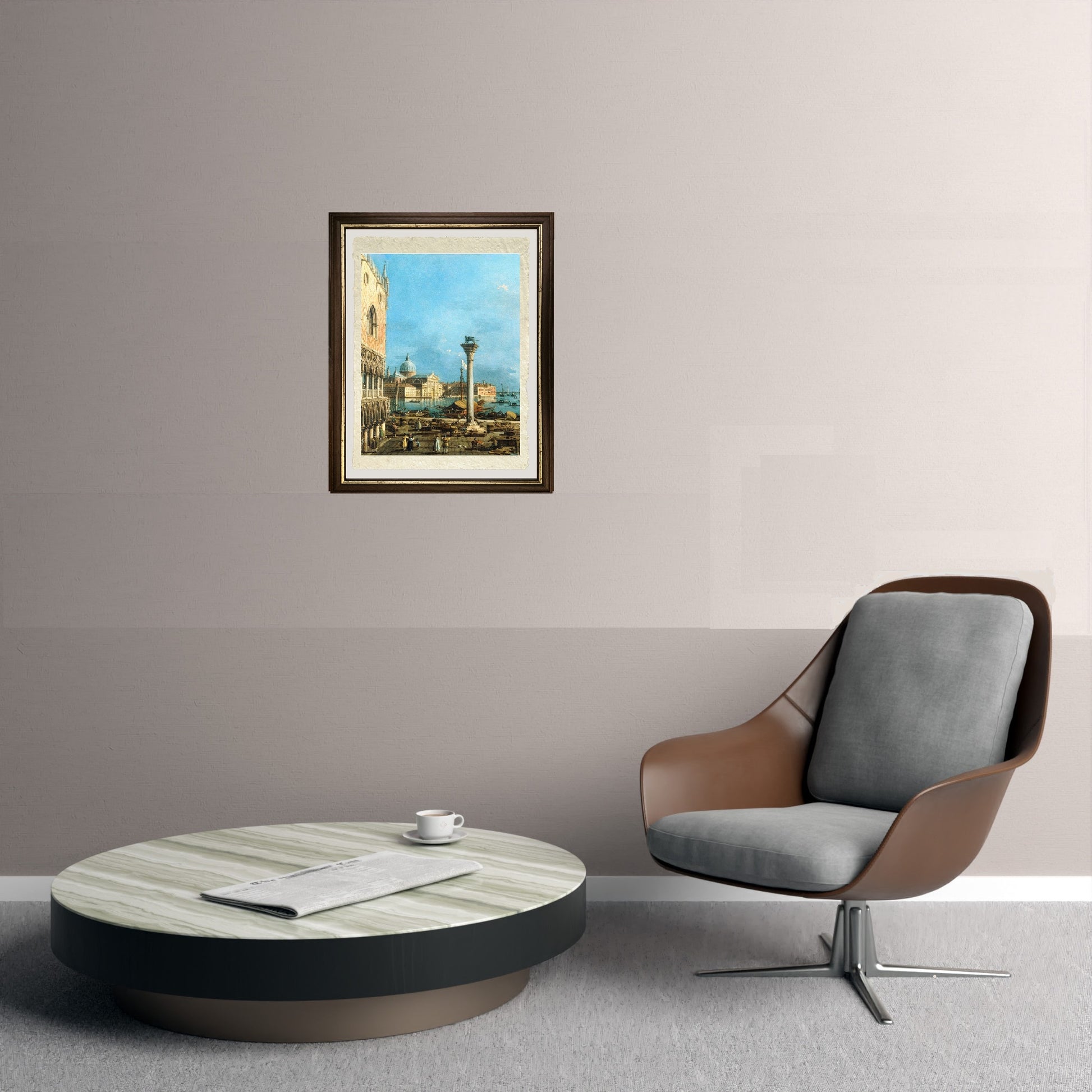 Original and luminous view of the Piazzetta di San Marco with a detail of the Doge's Palace, painted by Giovanni Antonio Canal, known as Canaletto. In the foreground there is the Doge's Palace, seen from the side, overlooking the square with scenes of daily life, and in the background there is the column of St. Mark. Further in the background there's the island of San Giorgio with its beautiful church. The clear sky, a deep blue, lends a special light to the entire painting.