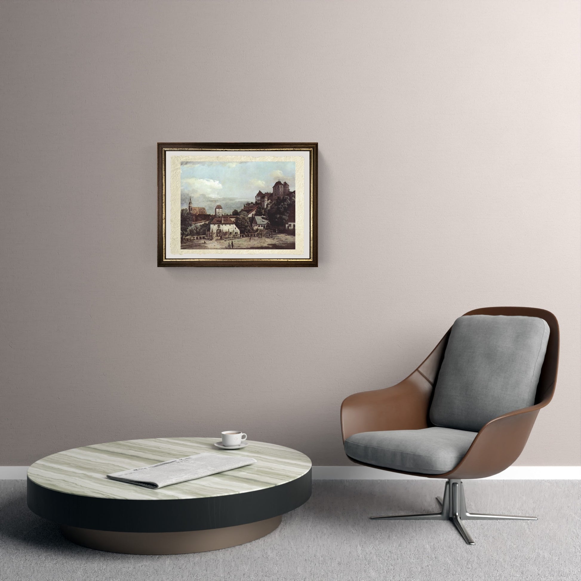 A bright and original view of the Obertor with a southern view of the town of Pirna, painted by Bernardo Bellotto. The castle stands out on the right side, perched on a hill and brightly lit, while the town of Pirna is further down the valley with its houses and buildings, from which the bell tower and church emerge. On the right side, a large meadow with scenes of everyday life is depicted. The sky is clear, but there are a few clouds on the horizon. The painting, an oil on canvas, is dated 1753.