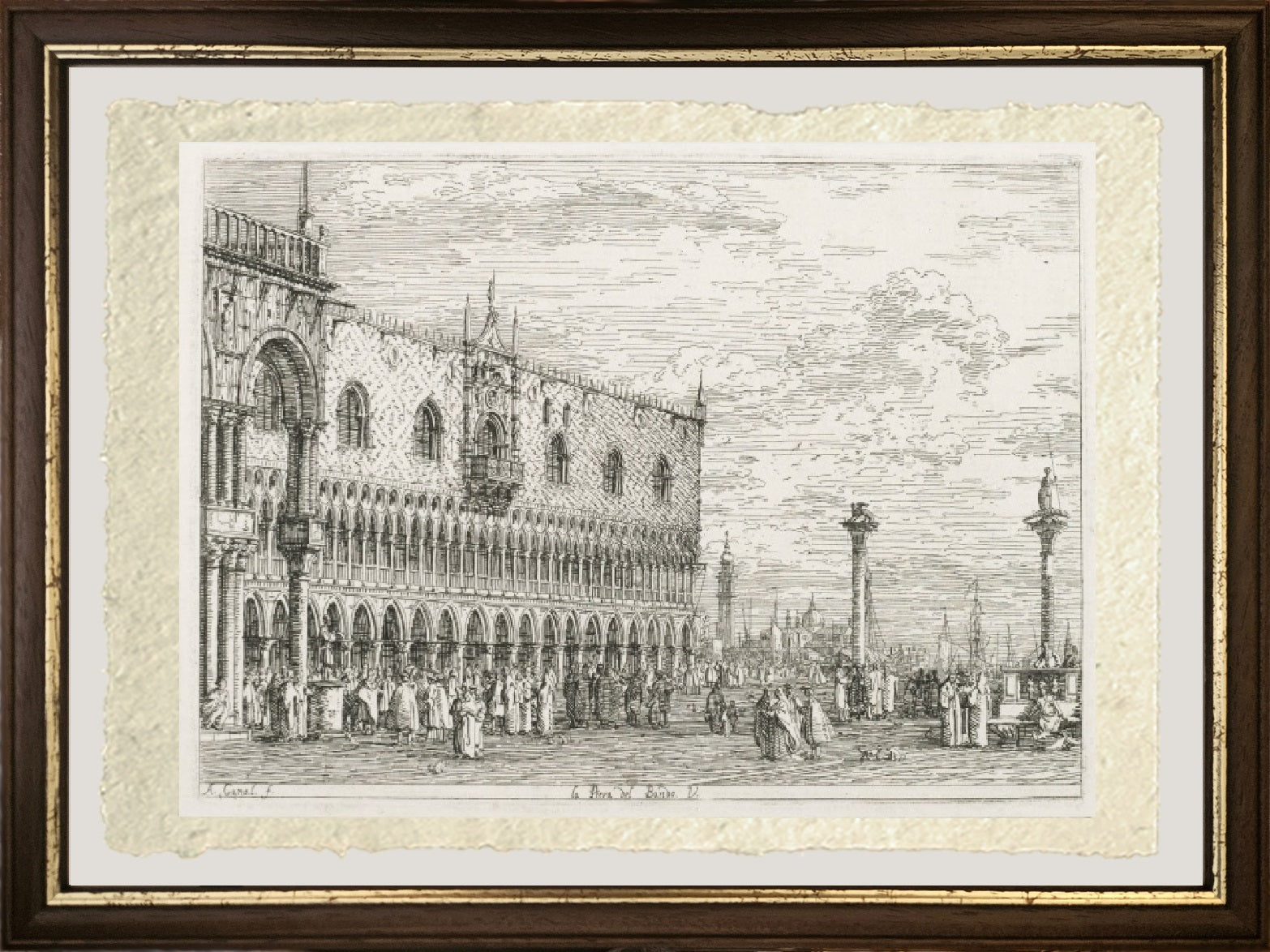 Original 18th-century engraving depicting the Proclamation Stone in Venice, created by Giovanni Antonio Canal, known as Canaletto. In the foreground there is the square, with people gathered near the Doge's Palace, and near one side of the Basilica where the stone is located. In the background there are the two columns of Venice and the island of San Giorgio Maggiore. The sky is cloudy.