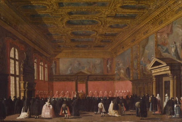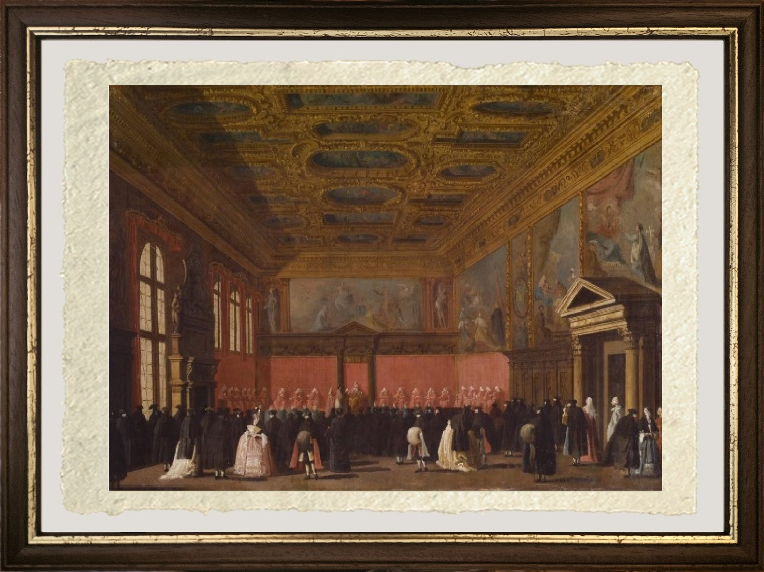 Original and rare 18th-century painting by Giovanni Antonio Canal, known as Canaletto, depicting a reception for foreign ambassadors. In the foreground there is the great hall of the Doge's Palace, where Venice's most illustrious notables gathered to greet the new ambassadors taking office in the Republic. The hall features frescoes and a decorated ceiling. The ladies invited to the reception are recognizable by their elegant dresses. The painting, an oil on canvas, is undated. Other variations of this work by Canaletto exist.