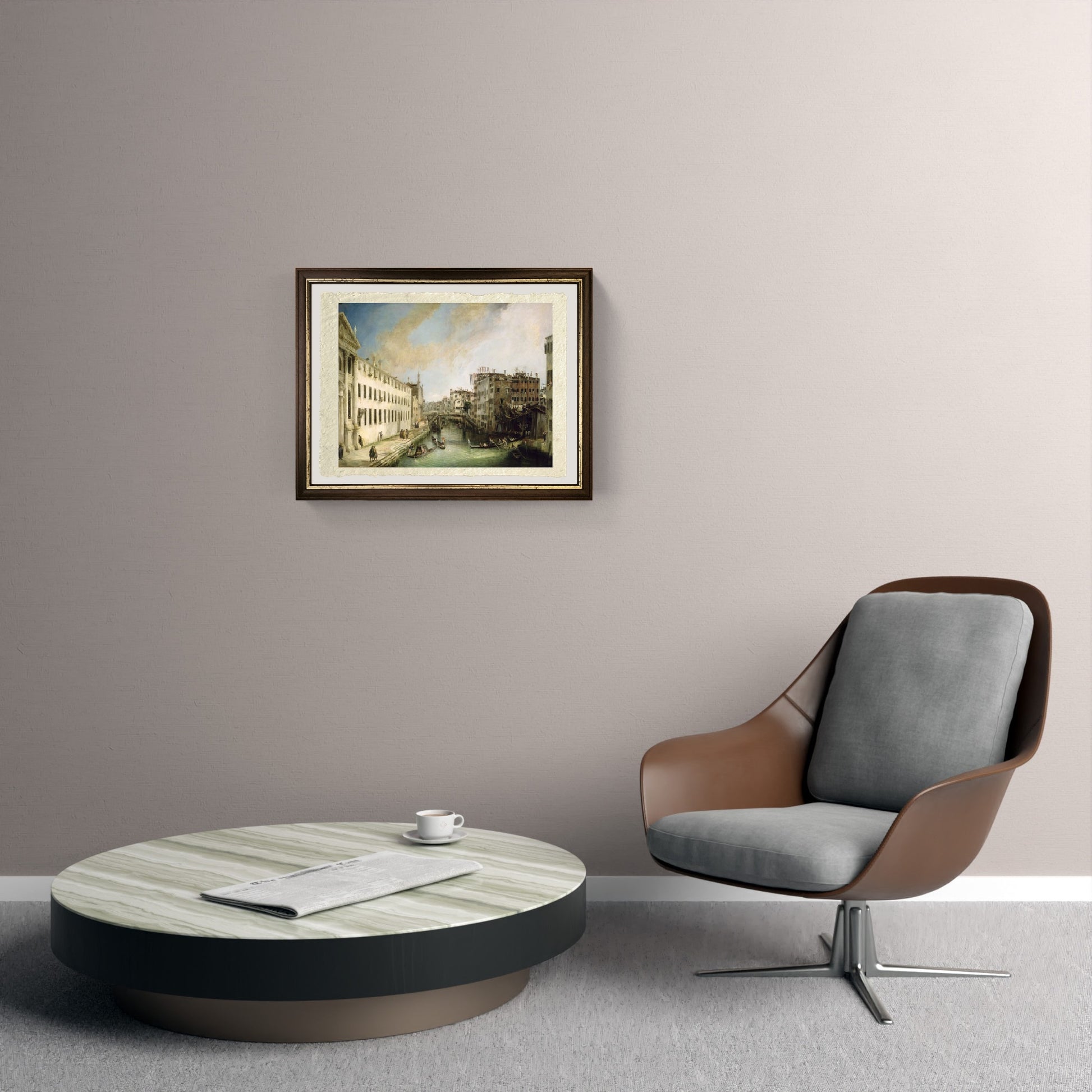 Original and rare 18th-century view of the Rio dei Mendicanti, with a light detail, painted by Giovanni Antonio Canal, known as Canaletto. In the foreground, a gondola is illuminated by a distinctive ray of light coming from the right, navigating the canal, the water painted in shades of light green and blue. The houses along the Rio dei Mendicanti are depicted as dilapidated, with laundry hanging out to dry. On the left, a church and a Venetian palace can be seen, particularly illuminated. The sky is slightly cloudy.