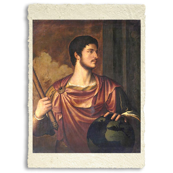 This work by Bernardino Campi, entitled "Portrait of the Emperor Octavian Augustus", is an example of Renaissance portraiture that reflects the revival of interest in classical antiquity typical of the period. The upright posture and firm grip of the spear evoke the Roman virtue of 'auctoritas'. The subject wears a purple toga, a detail that communicates not only social status, but also an almost divine aura, given that Augustus was venerated as a demigod after his death. The way he nonchalantly holds a globe is a subtle allusion to his dominion over the known world. The artist skillfully rendered the texture of the fabric and the complexity of the drapery, adding a sense of depth and volume to the painting. With a background that fades into a cloudy sky, Campi places his subject between men and gods, a union between heaven and earth that characterizes many of the great leaders of the past.