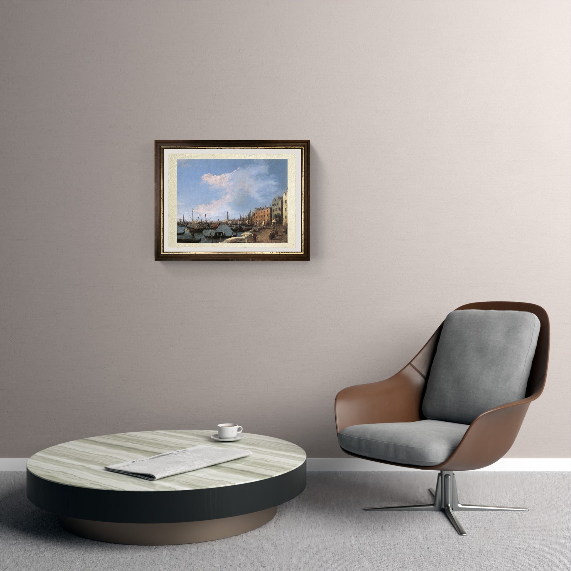 Original and rare 18th-century view of the Riva degli Schiavoni, with a detail of some of the buildings opposite, painted by Giovanni Antonio Canal, known as Canaletto. In the foreground there is the Riva degli Schiavoni quay, bustling with people and used as a landing stage for smaller boats, including gondolas. Many boats of various sizes are navigating the Grand Canal. The bell tower of St. Mark's Square is further in the background. The sky is slightly cloudy, tinged with light blue and light pink clouds.
