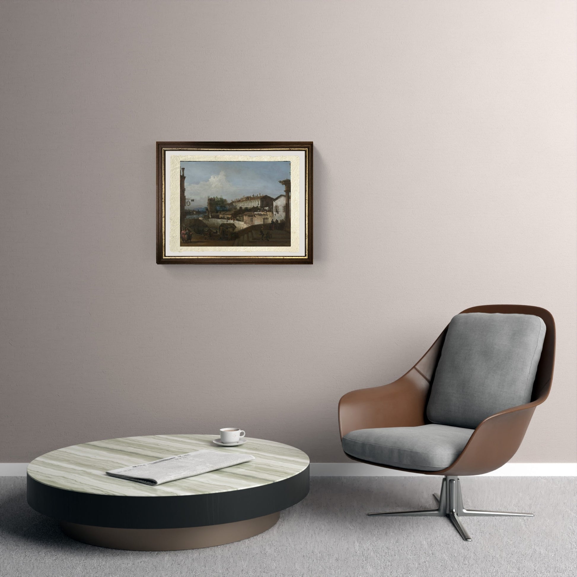 A rare and original view of the river lock in Dolo by Bernardo Bellotto. The popular housing above the lock is prominent, while a more elegant building stands out in the background. The high retaining wall overlooking the river is depicted in the foreground. On the left side, two people are clearly observing the landscape. The sky is clear, but there are a few clouds on the horizon. The painting, an oil on canvas, is undated.
