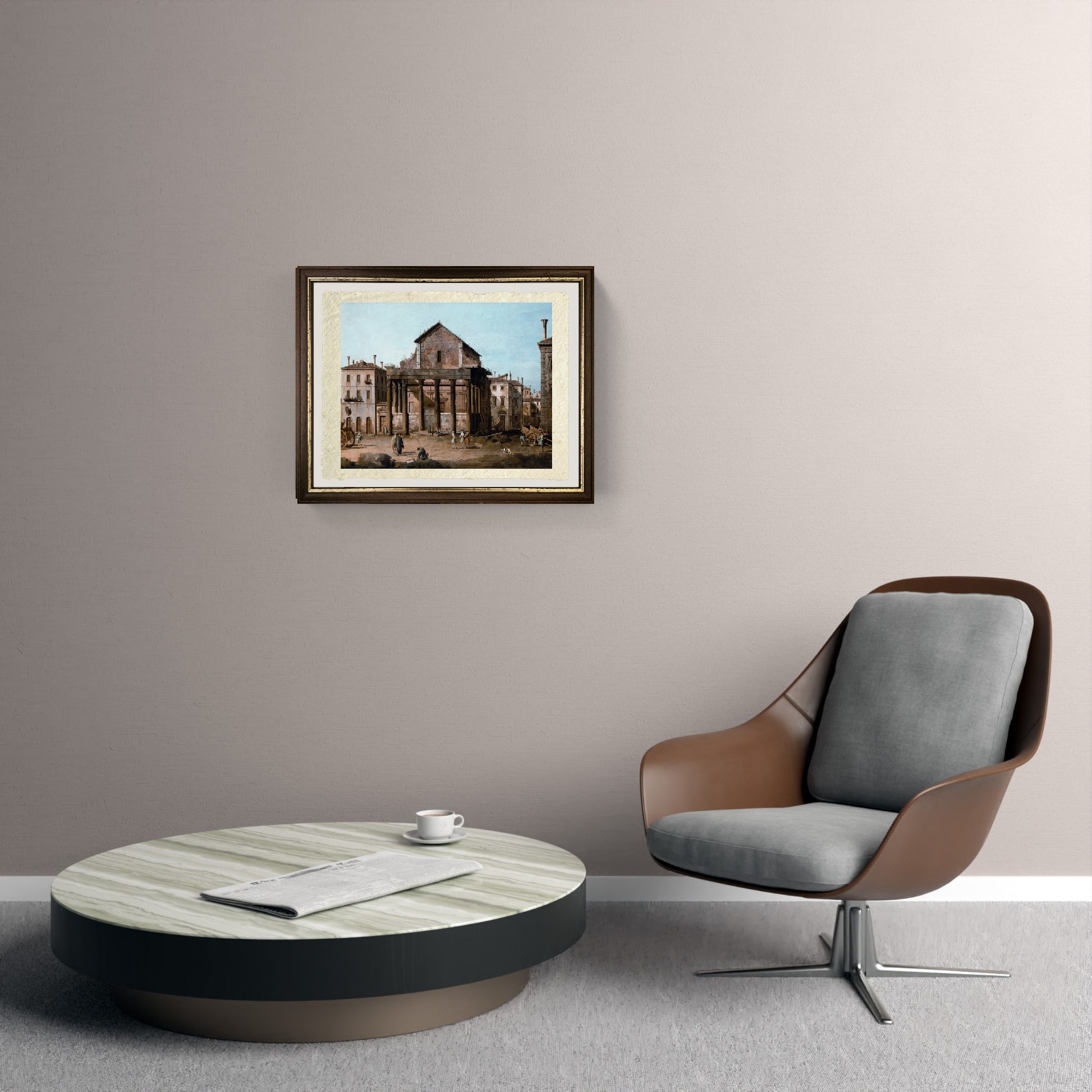 Original and rare historical and decaying view of the Temple of Antoninus and Faustina in Rome, painted by Bernardo Bellotto. The temple has been left to the ravages of time, with shrubs growing over the columns and roof. In the small square in front are scenes of daily life. Roman houses are located to the side and flank the temple. The sky is clear with a few white clouds.