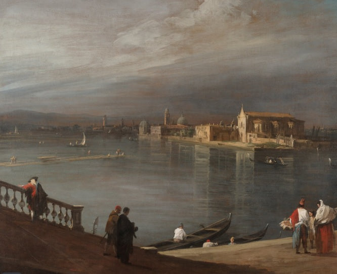 Original and rare 18th-century view of the islet of San Cristoforo, seen from a jetty on another island, by Giovanni Antonio Canal, known as Canaletto. In the foreground there is the staircase with two observers gazing at the landscape. Further in the background, but to the right, there is the island of San Cristoforo. The water is painted in shades of light green, light brown, and blue, echoing the hues of a cloudy sky.