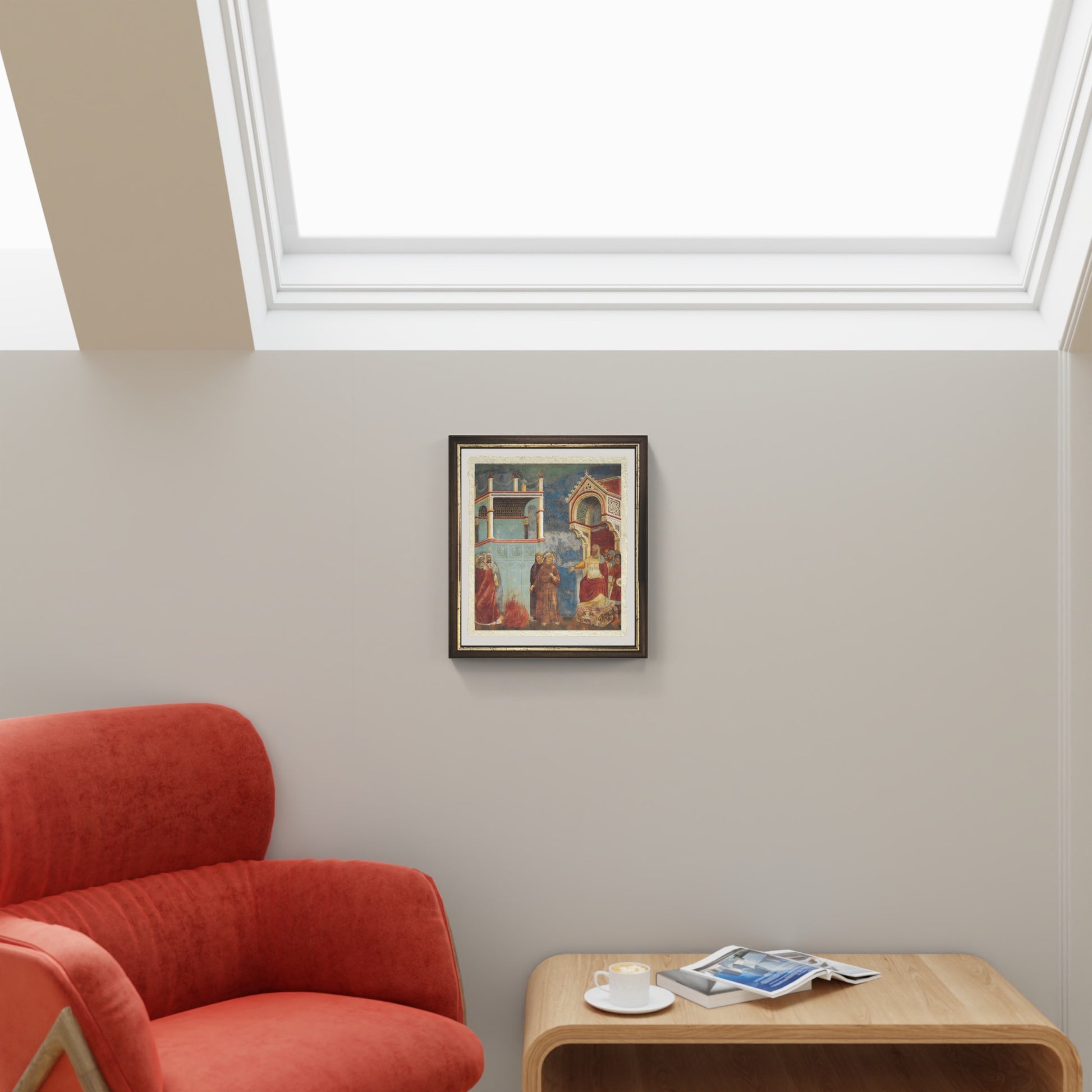 "Saint Francis Before the Sultan" is one of Giotto's famous frescoes in the Upper Basilica of Assisi, part of the cycle dedicated to the life of the saint. The work depicts the meeting between Saint Francis of Assisi and the Sultan of Egypt, Malik al-Kamil, during the Fifth Crusade, an episode that symbolizes the dialogue between different faiths and cultures. Giotto depicts the moment with great poise and humanity: the saint, humble yet steadfast in his faith, presents himself to the Muslim sovereign with a peaceful gesture, while those present look on in amazement.