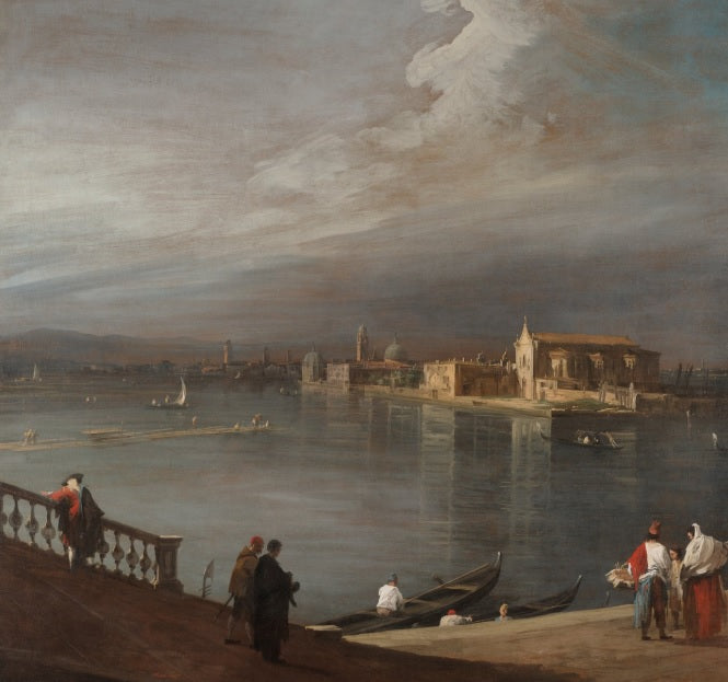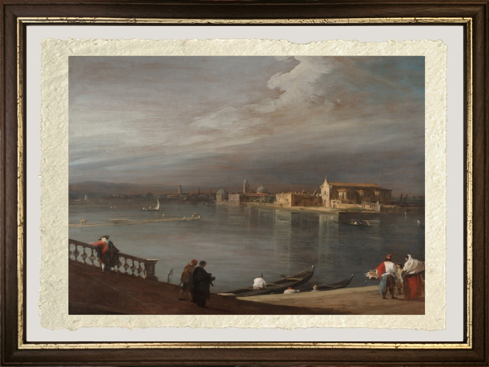 Original and rare 18th-century view of the islet of San Cristoforo, seen from a jetty on another island, painted by Giovanni Antonio Canal, known as Canaletto. In the foreground there is the staircase with two observers gazing at the landscape. Further in the background, but to the right, there's the island of San Cristoforo. The water is painted in shades of light green, light brown, and blue, echoing the hues of a cloudy sky.