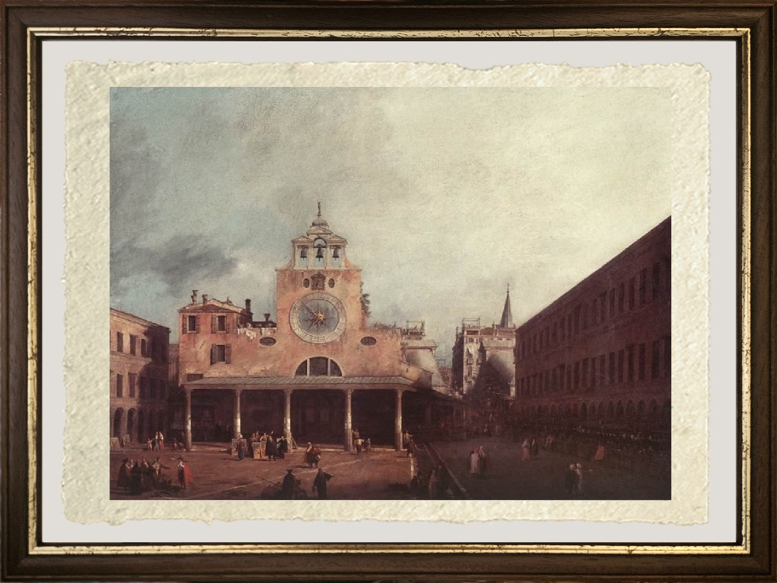 Original and rare 18th-century view of San Giacomo di Rialto, painted by Giovanni Antonio Canal, known as Canaletto. In the foreground there is the church of San Giacomo, with its colonnade, central sundial, and three bells above. In front of the churchyard there is a small square with scenes of daily life. On the right side of the painting there is a large palace in the shadow of a setting sun. The sky is threatening, and very dark clouds loom in the upper left.