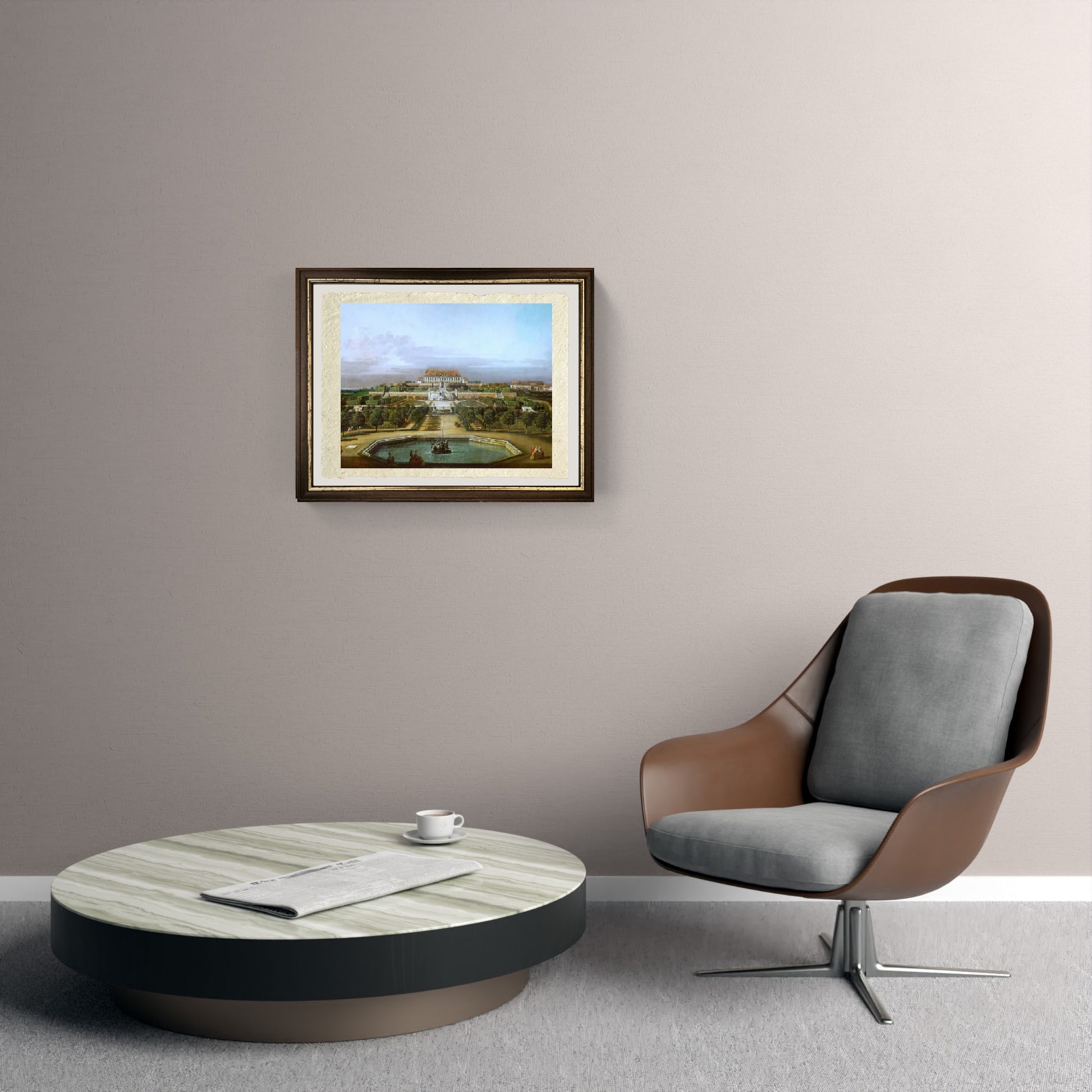 A magnificent and clear frontal view of the Schlosshof Imperial Palace, painted by Bernardo Bellotto. The large fountain dominates the foreground, surrounded by splendid Italian gardens. Further back and centrally located there is the Imperial Palace, with a detail of the entrance gate. The day is clear and serene. The painting, an oil on canvas, is dated 1758, and features three other similar depictions with varying color.