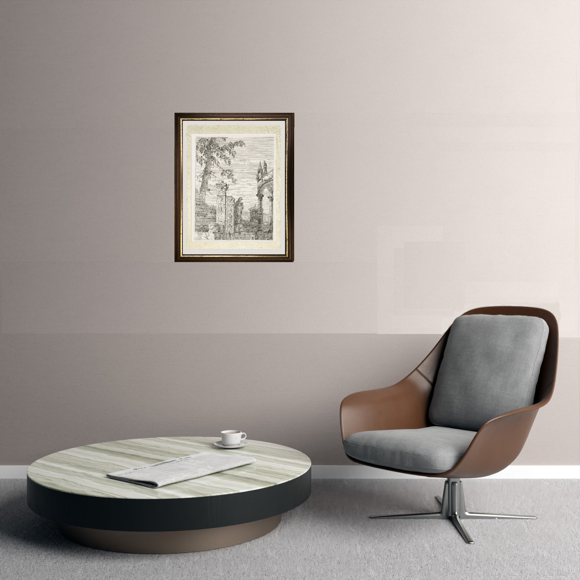 Original engraving with fragments of a sculpture by Giovanni Antonio Canal, known as Canaletto. In the foreground there is a plinth from which a Corinthian column rises, flanked by a statue. Near these sculptures there is a second colonnade, and further in the background is a third architectural monument. On the left side of the engraving there is a large tree; in the background the mountains and a clear, cloudless sky are depicted.