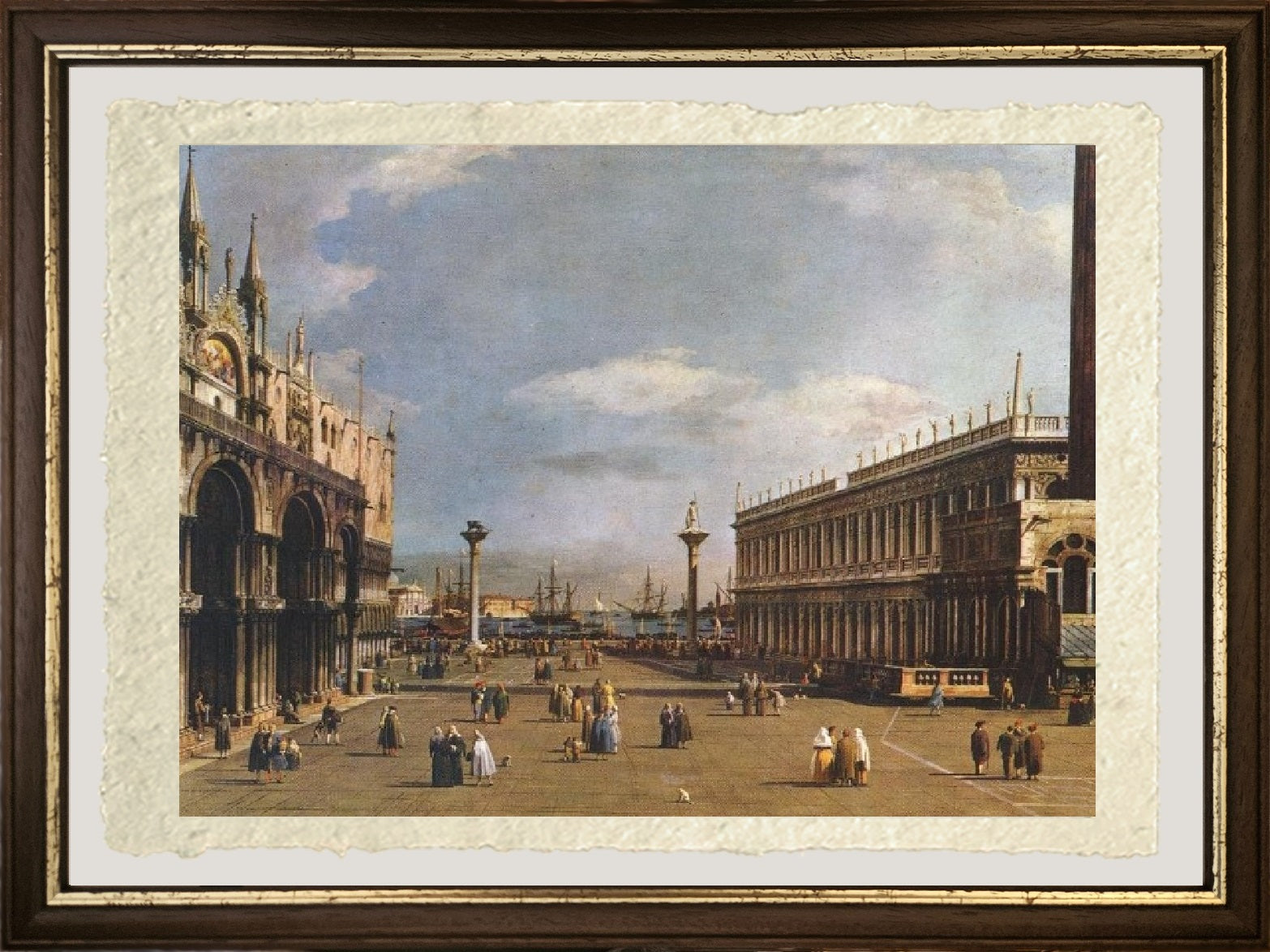 Original and luminous view of the Piazzetta di San Marco with a detail of the Basilica, painted by Giovanni Antonio Canal, known as Canaletto. In the foreground there is the small square with scenes of daily life, and in the background there are the two columns of San Marco and Todaro. On the right side there is a large building framed in perspective, and the entrance to the bell tower of San Marco. The sky is clear with a few white clouds on the horizon.